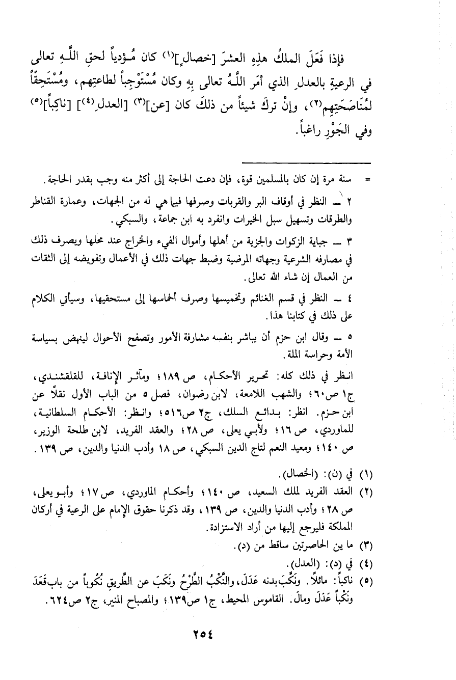 فَإِذا فعل الْملك هَذِه الْعشْر خِصَال كَانَ مُؤديا لحق الله تَعَالَى فِي الرّعية بِالْعَدْلِ الَّذِي أَمر الله تَعَالَى بِهِ وَكَانَ مستوجبا لطاعتهم ومستحقا لمناصحتهم وَإِن ترك شَيْئا من ذَلِك كَانَ عَن الْعدْل ناكبا وَفِي الْجور رَاغِبًا