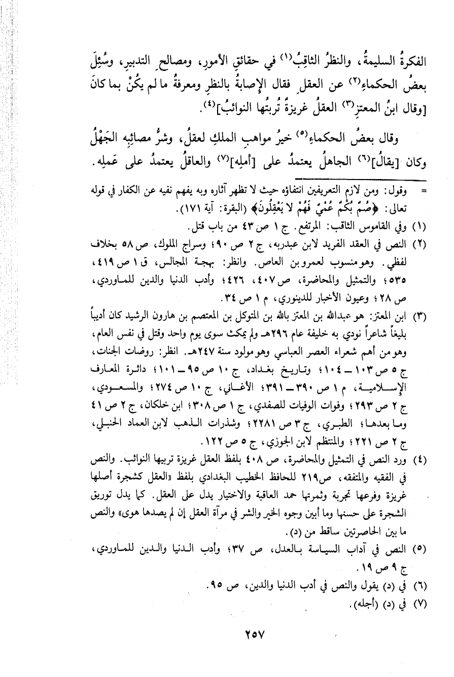 الفكرة السليمة وَالنَّظَر الثاقب فِي حقائق الْأُمُور ومصالح التَّدْبِير وَسُئِلَ بعض الْحُكَمَاء عَن الْعقل فَقَالَ الْإِصَابَة بِالنّظرِ وَمَعْرِفَة مَا لم يكن بِمَا كَانَ وَقَالَ ابْن المعتز الْعقل غريزة تربَتهَا النوائب