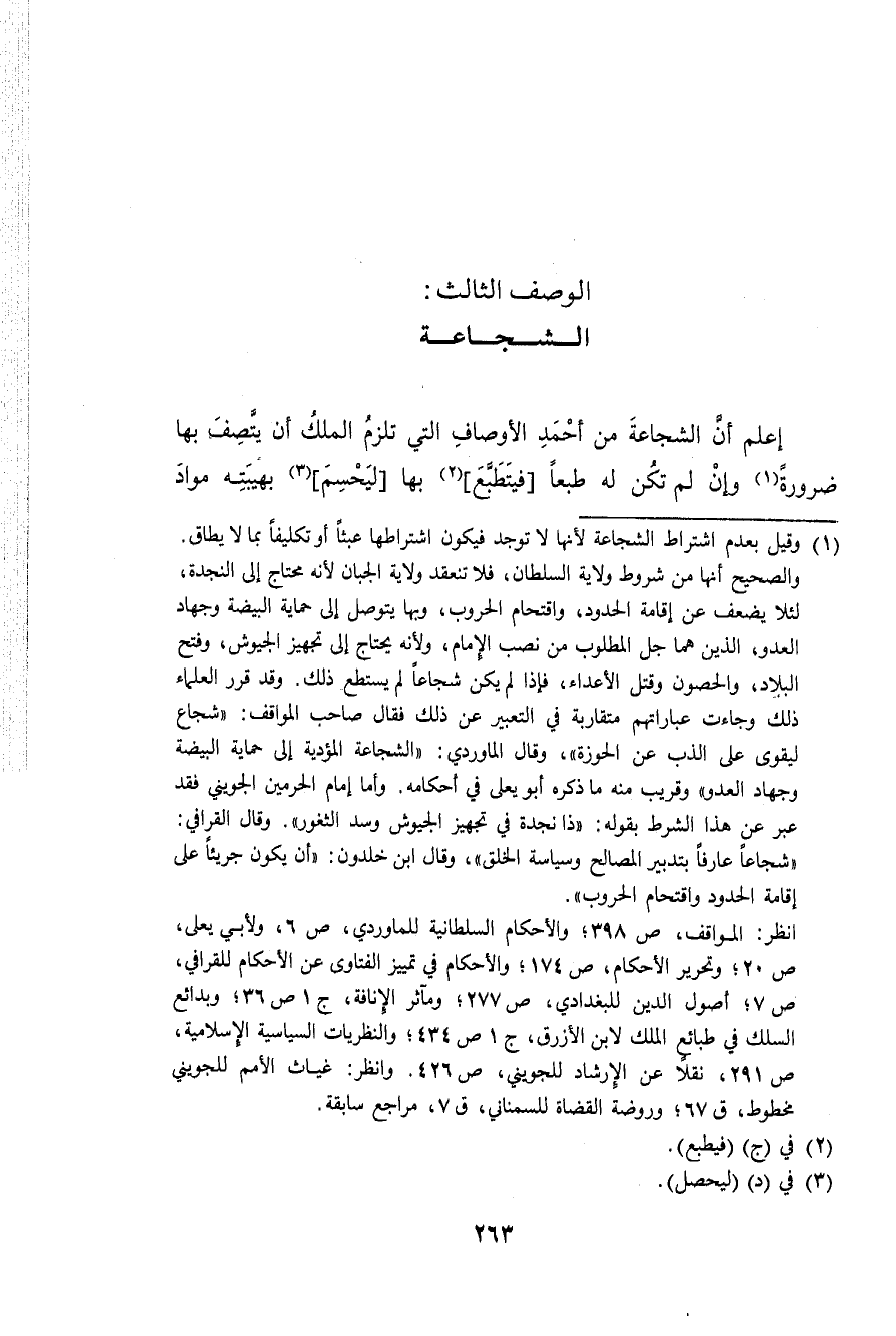 إعلم أَن الشجَاعَة من أَحْمد الْأَوْصَاف الَّتِي تلْزم الْملك أَن يَتَّصِف بهَا ضَرُورَة وَإِن لم تكن لَهُ طبعا فيتطبع بهَا ليحسم بهيبته مواد