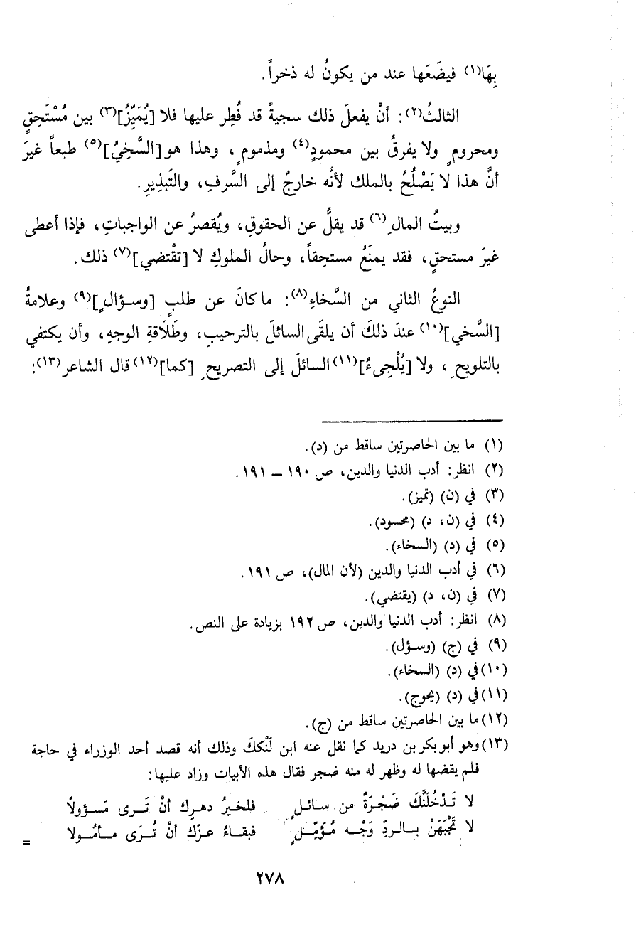 النَّوْع الثَّانِي من السخاء مَا كَانَ عَن طلب وسؤال وعلامة السخي عِنْد ذَلِك أَن يلقى السَّائِل بالترحيب وطلاقة الْوَجْه وَأَن يَكْتَفِي بالتلويح وَلَا يلجىء السَّائِل إِلَى التَّصْرِيح كَمَا قَالَ الشَّاعِر