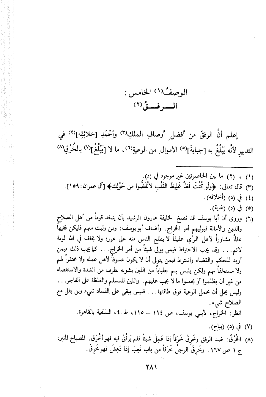 إعلم أَن الرِّفْق من أفضل أَوْصَاف الْملك وَأحمد خلائقه فِي التَّدْبِير لِأَنَّهُ يبلغ بِهِ جباية الْأَمْوَال من الرّعية مَا لَا يبلغ بالخرق