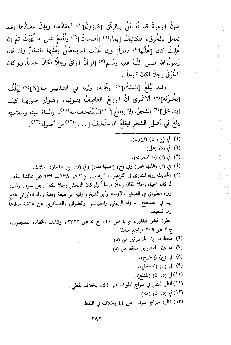 فَإِن الرّعية قد تعامل بالرفق فتزول أحقادها ويذل مقادها وَقد تعامل بالخرق فتكاشف بِمَا أضمرت وَتقدم على مَا نهيت ثمَّ إِن غلبت كَانَ غلبها دمارا وَإِن غلبت لم يحصل بغلبها افتخار وَقد قَالَ رَسُول الله ص = لَو أَن الرِّفْق رجلا لَكَانَ حسنا وَلَو كَانَ الْخرق رجلا لَكَانَ قبيحا