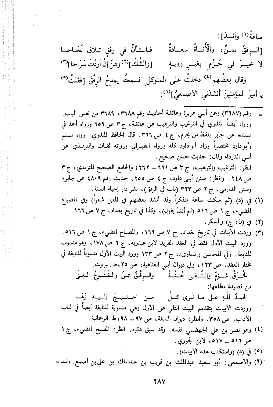 وَقَالَ بَعضهم دخلت على المتَوَكل فَسَمعته يمدح الرِّفْق فَقلت يَا أَمِير الْمُؤمنِينَ أَنْشدني الْأَصْمَعِي