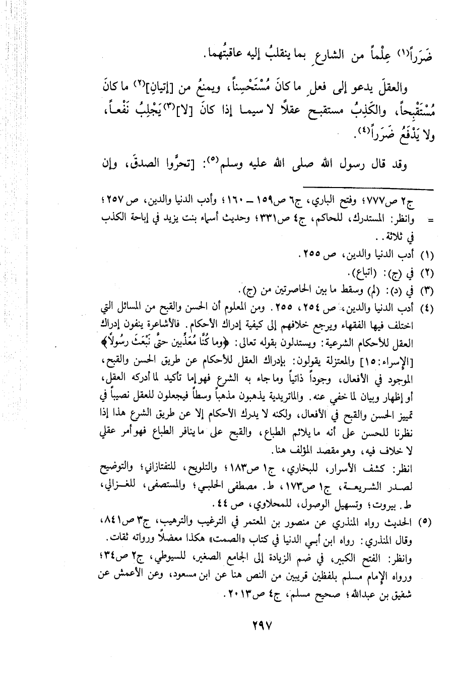 وَالْعقل يَدْعُو إِلَى فعل مَا كَانَ مستحسنا وَيمْنَع من إتْيَان مَا كَانَ مستقبحا وَالْكذب مستقبح عقلا لَا سِيمَا إِذا كَانَ لَا يجلب نفعا وَلَا يدْفع ضَرَرا