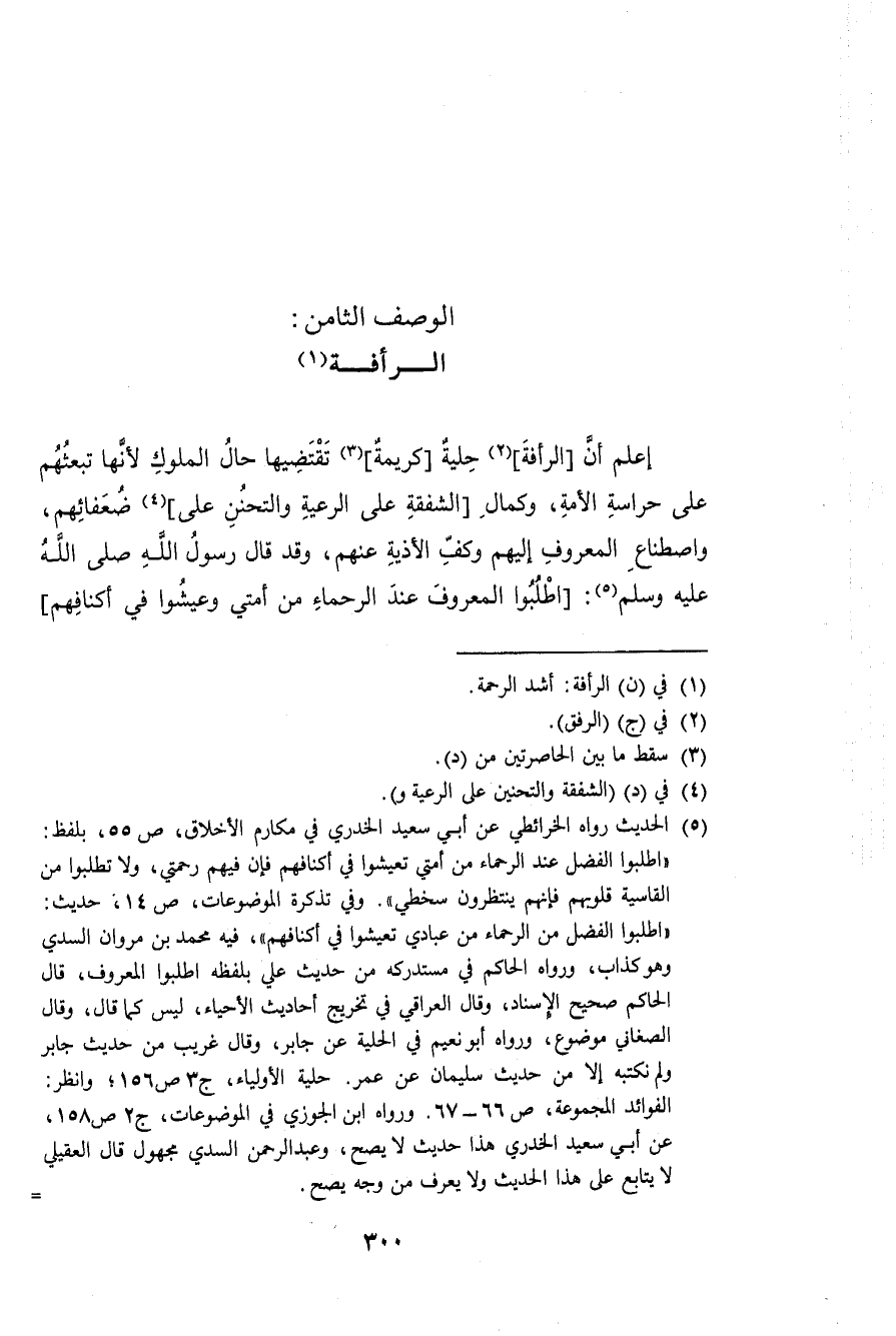 إعلم أَن الرأفة حلية كَرِيمَة تقتضيها حَال الْمُلُوك لِأَنَّهَا تبعثهم على حراسة الْأمة وَكَمَال الشَّفَقَة على الرّعية والتحنن على ضعفائهم واصطناع الْمَعْرُوف إِلَيْهِم وكف الأذية عَنْهُم وَقد قَالَ رَسُول الله ص = اطْلُبُوا الْمَعْرُوف عِنْد الرُّحَمَاء من امتي وعيشوا فِي أَكْنَافهم
