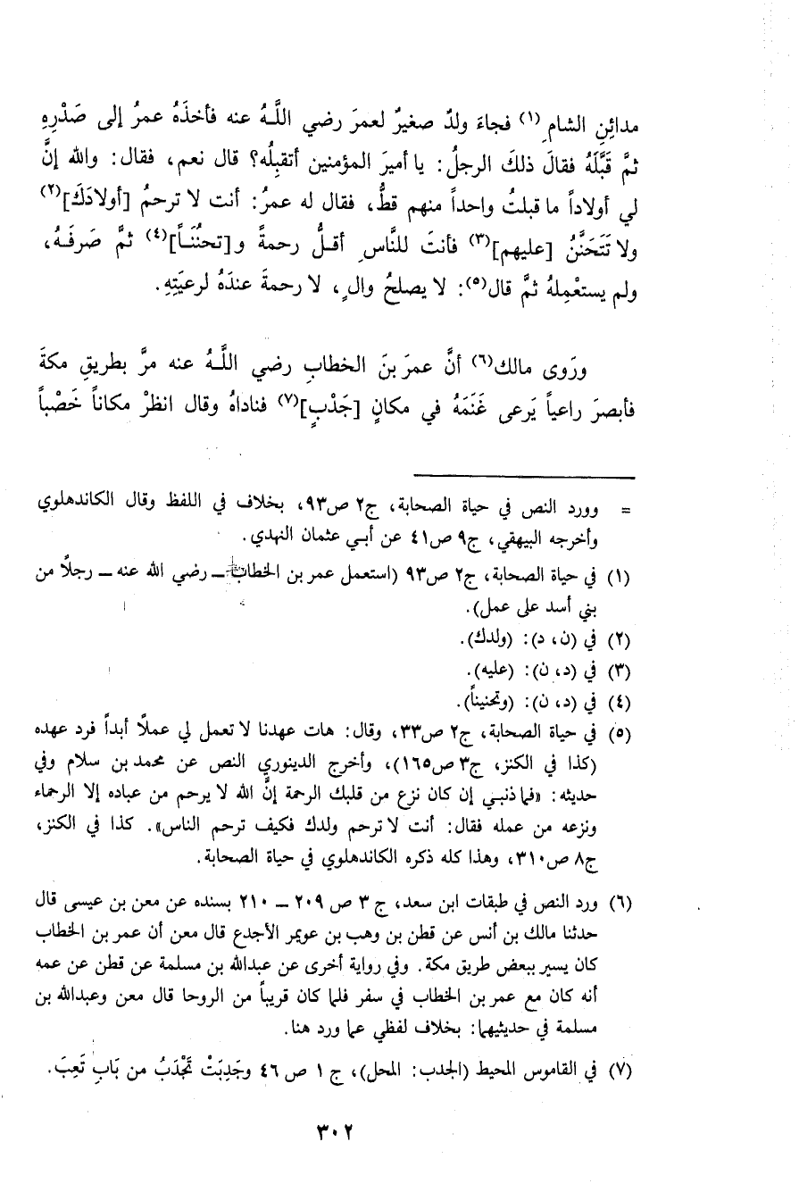 مَدَائِن الشَّام فجَاء ولد صَغِير لعمر رَضِي الله عَنهُ فَأَخذه عمر إِلَى صَدره ثمَّ قبله فَقَالَ ذَلِك الرجل يَا أَمِير الْمُؤمنِينَ أتقبله قَالَ نعم فَقَالَ وَالله إِن لي أَوْلَادًا مَا قبلت وَاحِدًا مِنْهُم قطّ فَقَالَ لَهُ عمر أَنْت لَا ترحم أولادك وَلَا تتحنن عَلَيْهِم فَأَنت للنَّاس أقل رَحْمَة وتحننا ثمَّ صرفه وَلم يَسْتَعْمِلهُ ثمَّ قَالَ لَا يصلح وَال لَا رَحْمَة عِنْده لرعيته