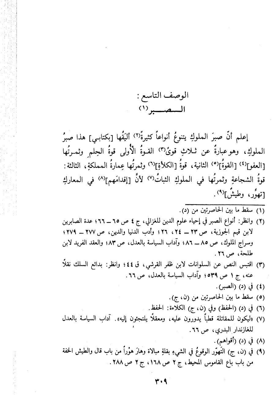 إعلم أَن صَبر الْمُلُوك يتنوع أنواعا كَثِيرَة أليقها بكتابي هَذَا صَبر الْمُلُوك وَهُوَ عبارَة عَن ثَلَاث قوى الْقُوَّة الأولى قُوَّة الْحلم وثمرتها الْعَفو الْقُوَّة الثَّانِيَة قُوَّة الكلأة وثمرتها عمَارَة المملكة الثَّالِثَة قُوَّة الشجَاعَة وثمرتها فِي الْمُلُوك الثَّبَات لِأَن إقدامهم فِي المعارك تهور وطيش