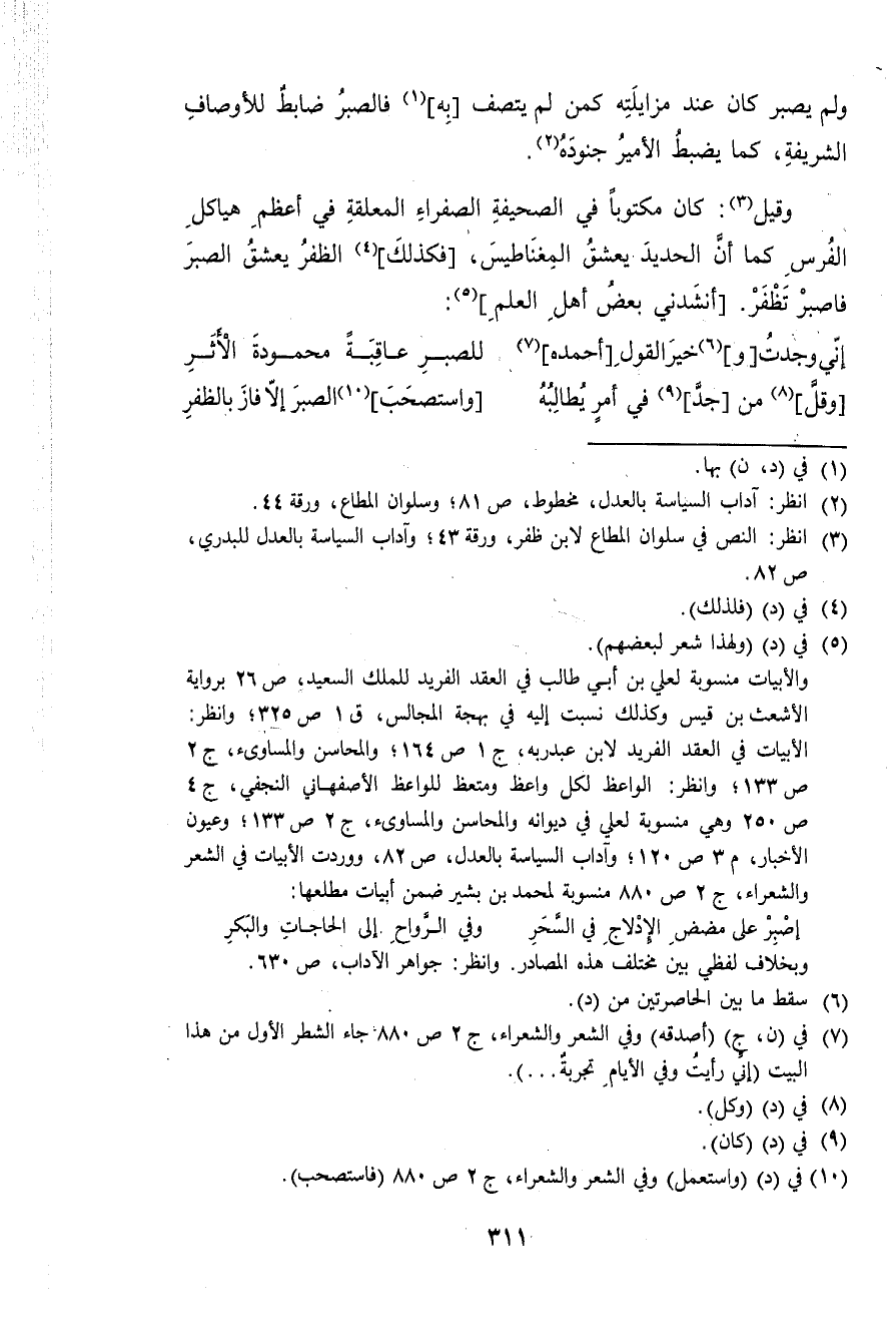 وَقيل كَانَ مَكْتُوبًا فِي الصَّحِيفَة الصَّفْرَاء الْمُعَلقَة فِي أعظم هياكل الْفرس كَمَا أَن الْحَدِيد يعشق المغناطيس فَكَذَلِك الظفر يعشق الصَّبْر فاصبر تظفر أَنْشدني بعض أهل الْعلم
