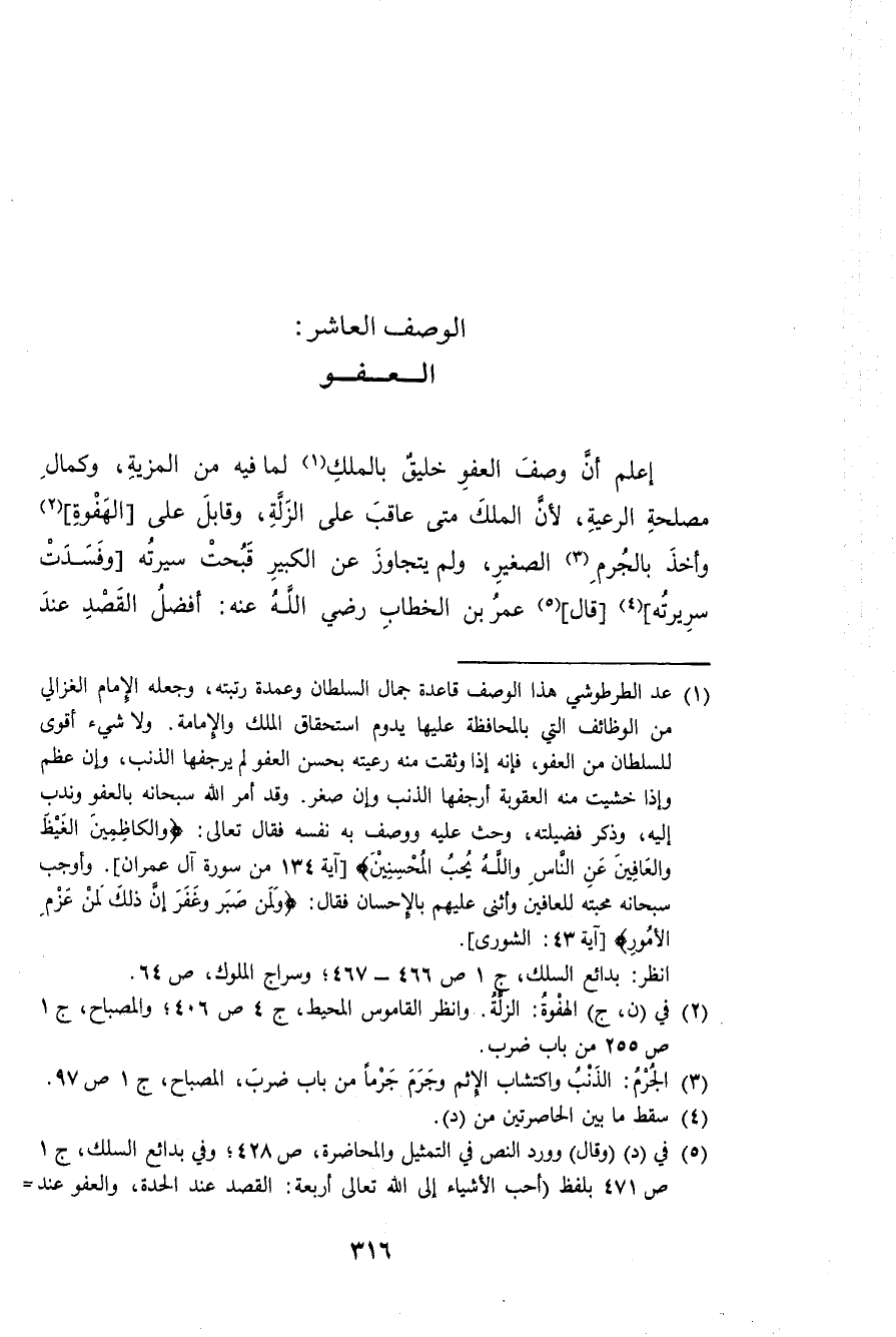 اعْلَم أَن وصف الْعَفو خليق بِالْملكِ لما فِيهِ من المزية وَكَمَال مصلحَة الرّعية لِأَن الْملك مَتى عاقب على الزلة وقابل على الهفوة وَأخذ بالجرم الصَّغِير وَلم يتَجَاوَز عَن الْكَبِير قبحت سي رته وفسدت سَرِيرَته قَالَ عمر بن الْخطاب رَضِي الله عَنهُ أفضل الْقَصْد عِنْد