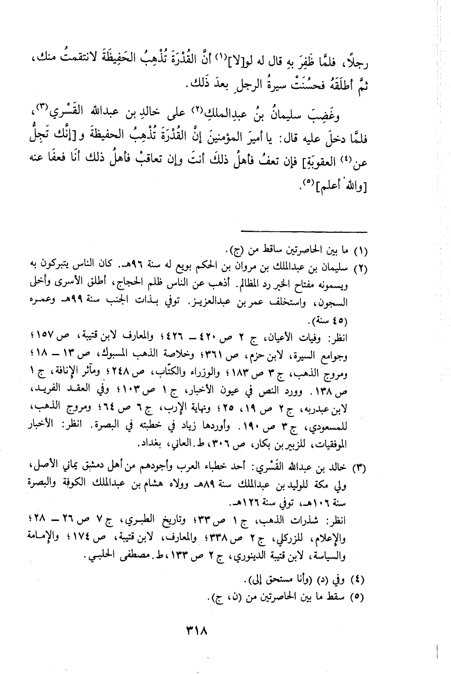 وَغَضب سُلَيْمَان بن عبد الْملك على خَالِد بن عبد الله الْقَسرِي فَلَمَّا دخل عَلَيْهِ قَالَ يَا أَمِير الْمُؤمنِينَ إِن الْقُدْرَة تذْهب الحفيظة وَإنَّك تجل عَن الْعقُوبَة فَإِن تعف فَأهل ذَلِك أَنْت وَإِن تعاقب فاهل ذَلِك أَنا فَعَفَا عَنهُ وَالله أعلم