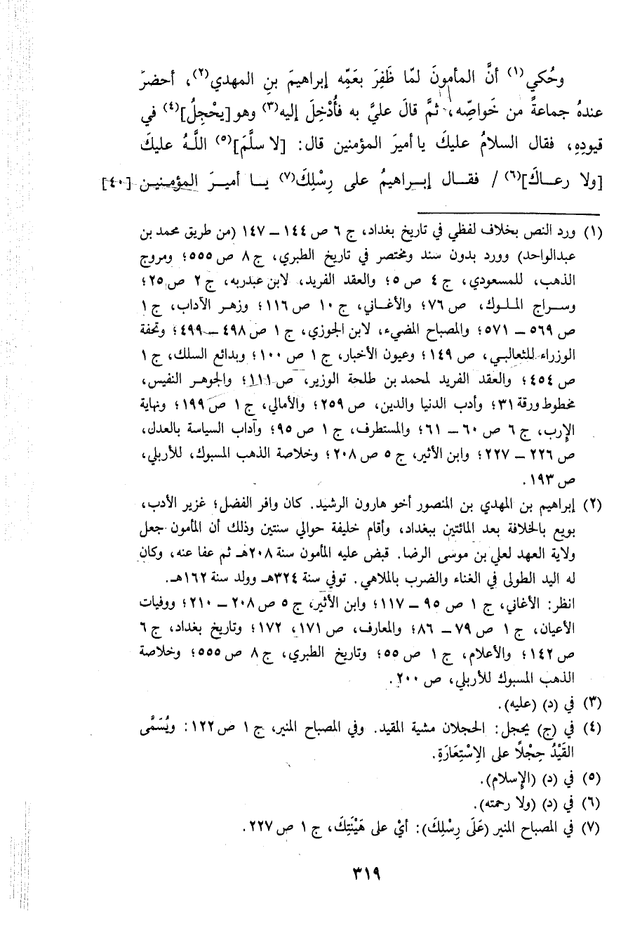 وَحكي أَن الْمَأْمُون لما طفر بعم إِبْرَاهِيم بن الْمهْدي أحضر عِنْده جمَاعَة من خواصه ثمَّ قَالَ عَليّ بِهِ فَأدْخل إِلَيْهِ وَهُوَ يحجل فِي قيوده فَقَالَ السَّلَام عَلَيْك يَا أَمِير الْمُؤمنِينَ قَالَ لَا سلم الله عَلَيْك وَلَا رعاك فَقَالَ إِبْرَاهِيم على رسلك يَا أَمِير الْمُؤمنِينَ