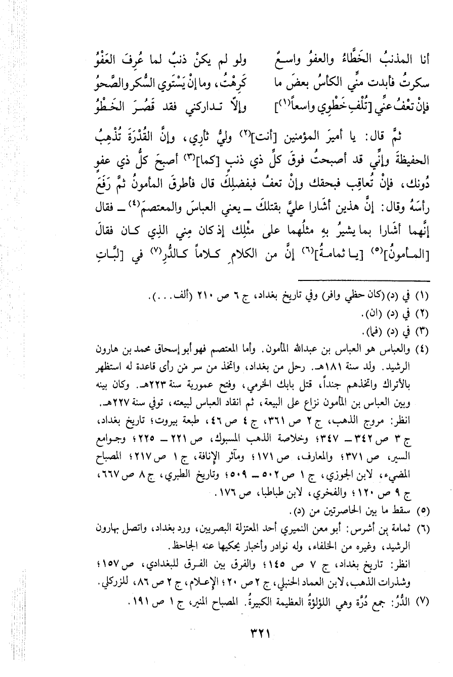ثمَّ قَالَ يَا أَمِير الْمُؤمنِينَ انت ولي ثَأْرِي وَإِن الْقُدْرَة تذْهب الحفيظة وَإِنِّي قد أَصبَحت فَوق كل ذِي ذَنْب كَمَا أصبح كل ذِي عَفْو دُونك فَإِن تعاقب فبحقك وَإِن تعف فبفضلك قَالَ فاطرق الْمَأْمُون ثمَّ رفع رَأسه وَقَالَ إِن هذَيْن اشارا عَليّ بقتلك يَعْنِي الْعَبَّاس والمعتصم فَقَالَ إنَّهُمَا أشارا بِمَا يُشِير بِهِ مثلهمَا على مثلك إِذْ كَانَ مني الَّذِي كَانَ فَقَالَ الْمَأْمُون يَا ثُمَامَة إِن من الْكَلَام كلَاما كالدر فِي لبات