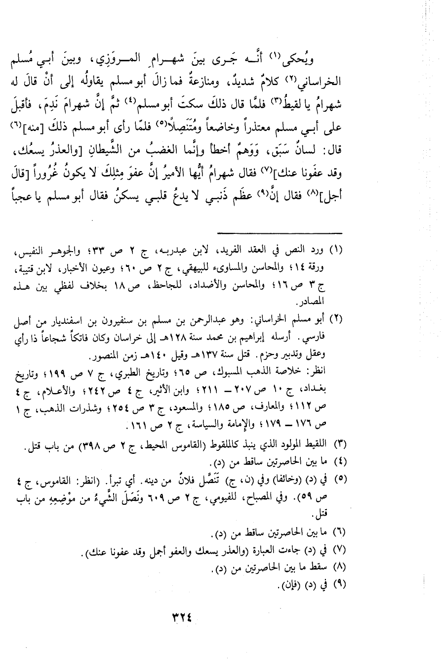ويحكي أَنه جرى بَين شهرام الْمروزِي وَبَين أبي مُسلم الْخُرَاسَانِي كَلَام شَدِيد ومنازعة فمازال أَبُو مُسلم يقاوله إِلَى أَن قَالَ لَهُ شهرام يالقيط فَلَمَّا قَالَ ذَلِك سكت أَبُو مُسلم ثمَّ إِن شهرام نَدم فَأقبل على أبي مُسلم معتذرا وخاضعا ومتنصلا فَلَمَّا رأى أَبُو مُسلم ذَلِك مِنْهُ قَالَ لِسَان سبق وَوهم أَخطَأ وَإِنَّمَا الْغَضَب من الشَّيْطَان والعذر يسعك وَقد عَفَوْنَا عَنْك فَقَالَ شهرام أَيهَا الْأَمِير إِن عَفْو مثلك لَا يكون غرُورًا قَالَ أجل فَقَالَ إِن عظم ذَنبي لَا يدع قلبِي يسكن فَقَالَ أَبُو مُسلم يَا عجبا