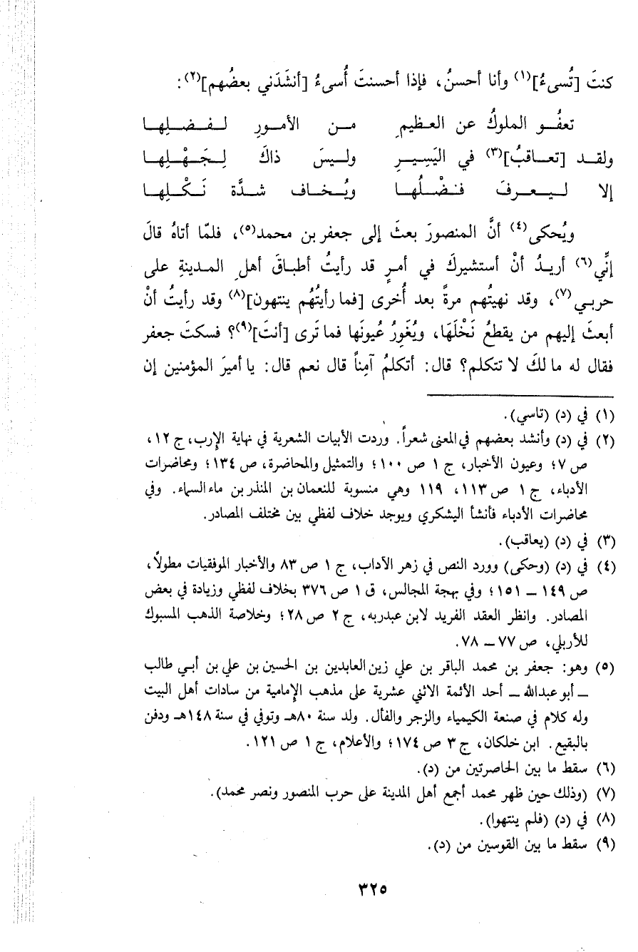 ويحكي أَن الْمَنْصُور بعث إِلَى جَعْفَر بن مُحَمَّد فَلَمَّا أَتَاهُ قَالَ إِنِّي أُرِيد أَن أستشيرك فِي أَمر قد رَأَيْت أطباق أهل الْمَدِينَة على حَرْبِيّ وَقد نهيتهم مرّة بعد أُخْرَى فَمَا رَأَيْتهمْ ينتهون وَقد رَأَيْت أَن أبْعث إِلَيْهِم من يقطع نخلها ويغور عيونها فَمَا ترى أَنْت فَسكت جَعْفَر فَقَالَ لَهُ مَا لَك لَا تَتَكَلَّم قَالَ أَتكَلّم آمنا قَالَ نعم قَالَ يَا أَمِير الْمُؤمنِينَ إِن