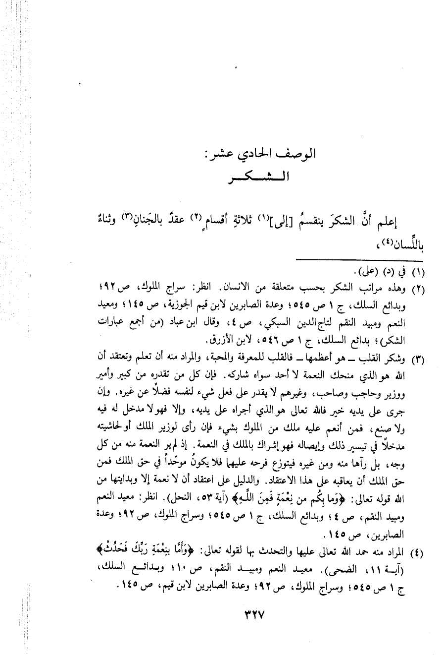 إعلم أَن الشُّكْر يَنْقَسِم إِلَى ثَلَاثَة أَقسَام عقد بالجنان وثناء بِاللِّسَانِ