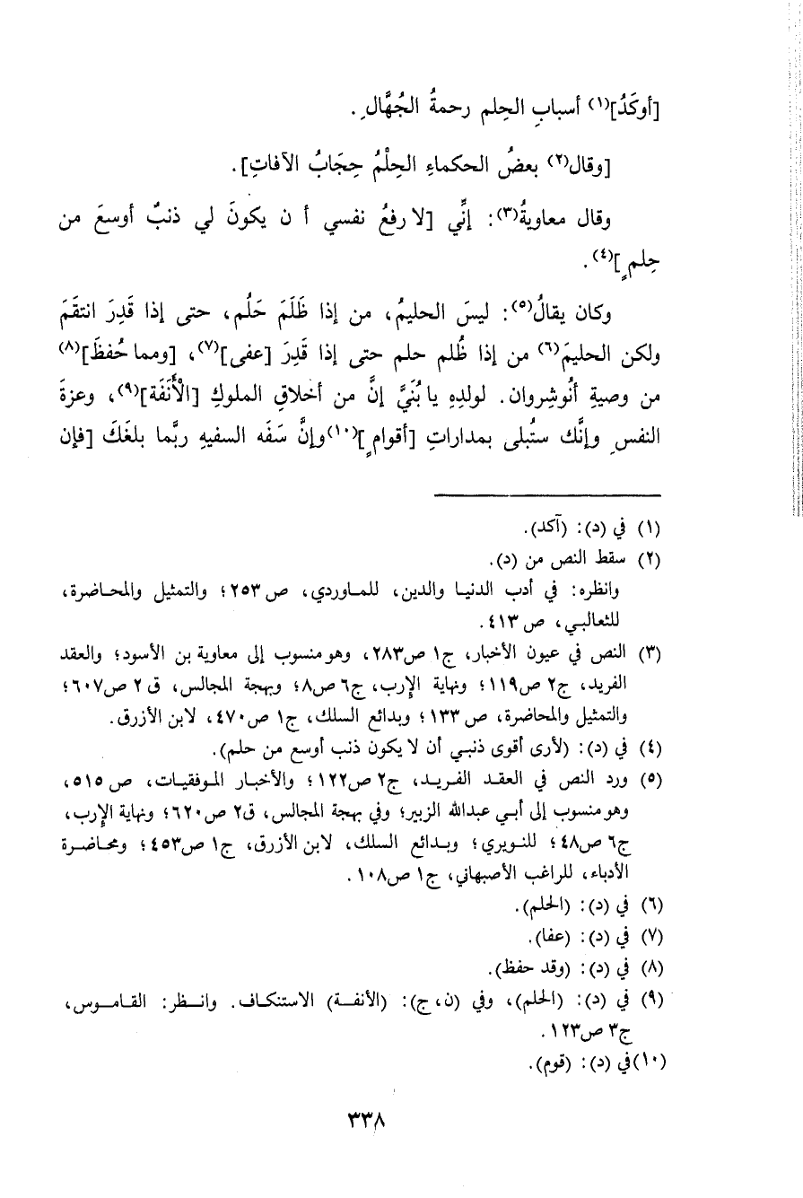 وَكَانَ يُقَال لَيْسَ الْحَلِيم من إِذا ظلم حلم حَتَّى إِذا قدر انتقم وَلَكِن الْحَلِيم من إِذا ظلم حلم حَتَّى إِذا قدر عفى وَمِمَّا حفظ من وَصِيّه أنوشروان لوَلَده يَا بني إِن من أَخْلَاق الْمُلُوك الأنفة وَعزة النَّفس وَإنَّك ستبلى بمدارات أَقوام وَإِن سفه السَّفِيه رُبمَا بلغك فَإِن