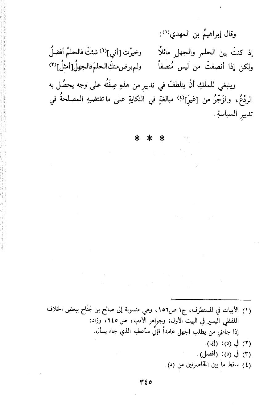 (إِذا كنت بَين الْحلم وَالْجهل ماثلا ... وخيرت أَنِّي شِئْت فالحلم افضل)