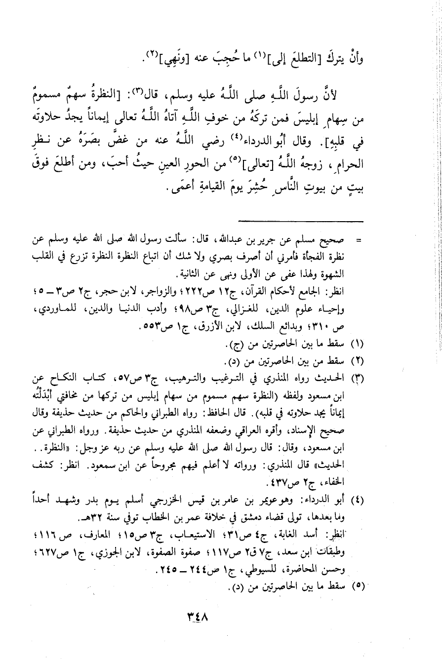 لِأَن رَسُول الله صلى الله عَلَيْهِ وَسلم قَالَ النظرة سهم مَسْمُوم من سِهَام إِبْلِيس فَمن تَركه من خوف الله آتَاهُ الله تَعَالَى إِيمَانًا يجد حلاوته فِي قلبه وَقَالَ أَبوهُ الدَّرْدَاء رَضِي الله عَنهُ من غض بَصَره عَن نظر الْحَرَام زوجه الله تَعَالَى من الْحور الْعين حَيْثُ أحب وَمن أطلع فَوق بَيت من بيُوت النَّاس حشر يَوْم الْقِيَامَة أعمى