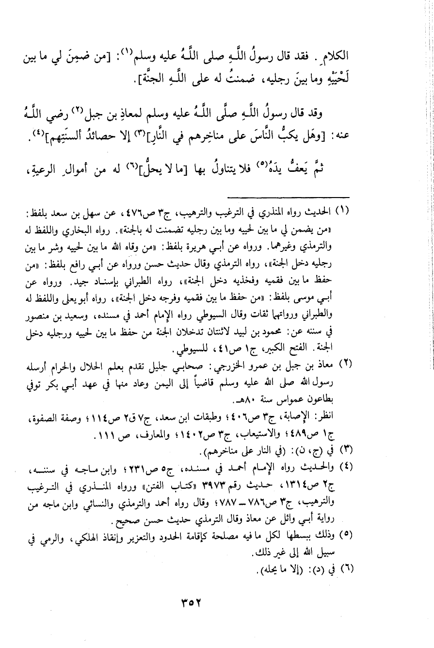 الْكَلَام فقد قَالَ رَسُول الله صلى الله عَلَيْهِ وَسلم من ضمن لي مَا بَين لحييْهِ وَمَا بَين رجلَيْهِ ضمنت لَهُ على الله الْجنَّة