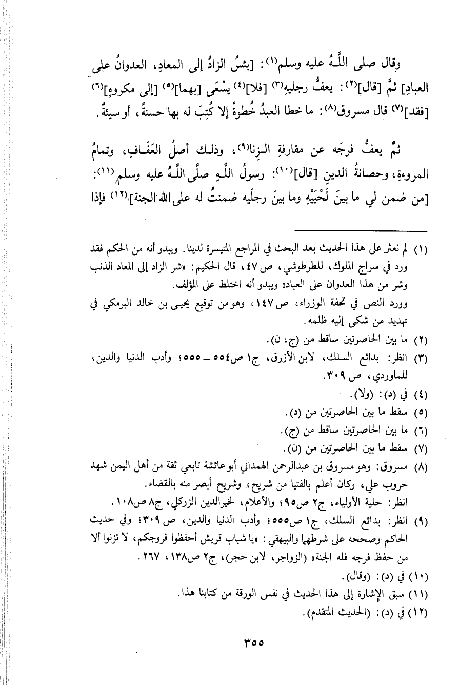 وَقَالَ صلى الله عَلَيْهِ وَسلم بئس الزَّاد إِلَى الْمعَاد الْعدوان على الْعباد ثمَّ قَالَ يعف رجلَيْهِ فَلَا يسْعَى بهما إِلَى مَكْرُوه فقد قَالَ مَسْرُوق مَا خطا العَبْد خطْوَة إِلَّا كتب لَهُ بهَا حَسَنَة أوسيئة