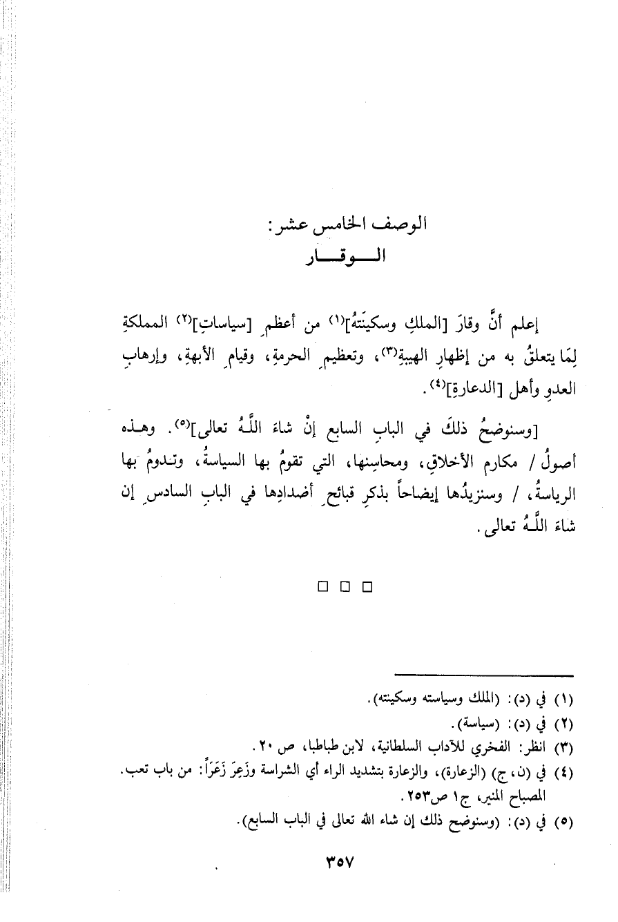 وسنوضح ذَلِك فِي الْبَاب السَّابِع إِن شَاءَ الله تَعَالَى وَهَذِه أصُول مَكَارِم الخلاق ومحاسنها الَّتِي تقوم بهَا السياسة وتدوم بهَا الرياسة وسنزيدها إيضاحا بِذكر قبائح أضدادها فِي الْبَاب السَّادِس إِن شَاءَ الله تَعَالَى