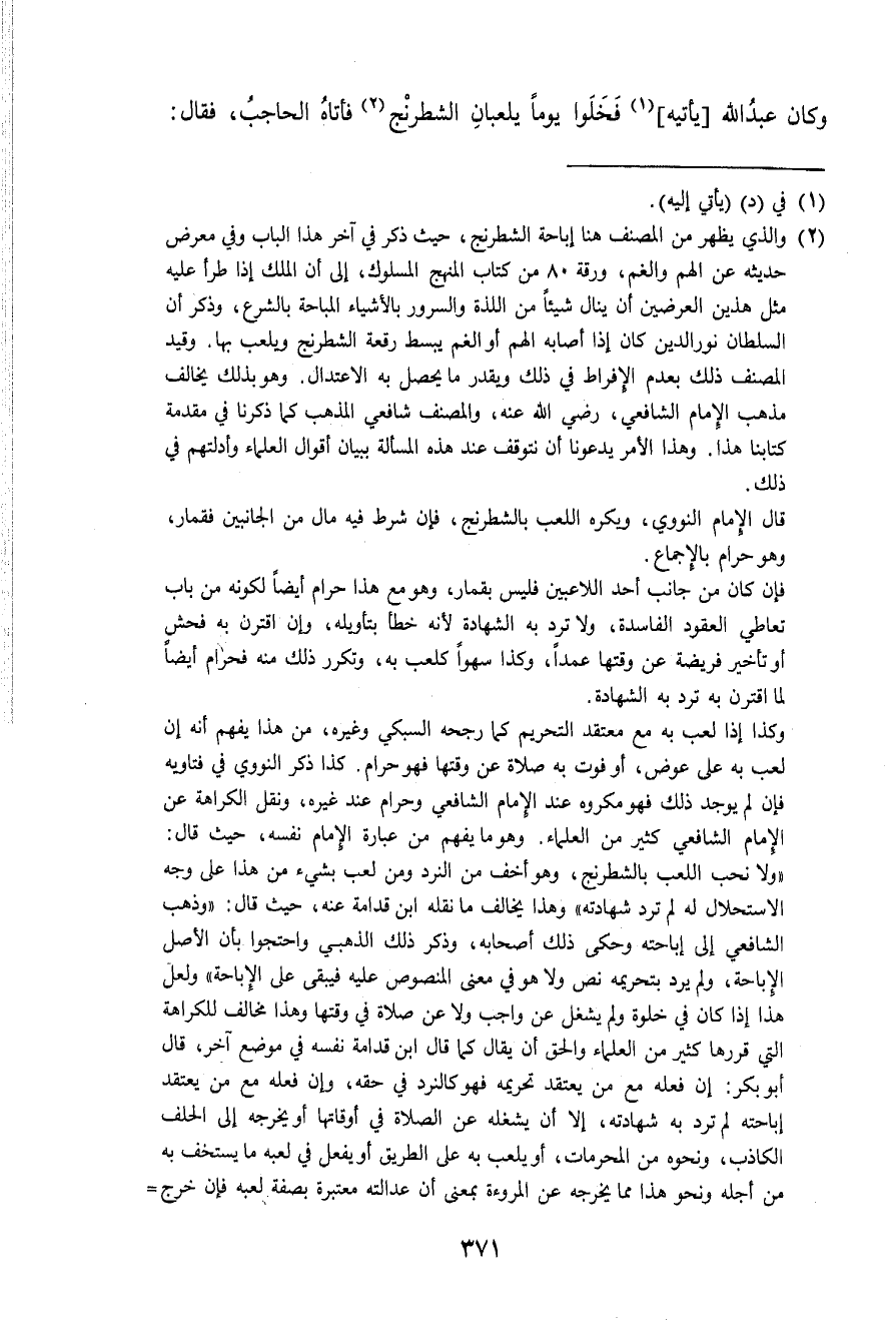وَكَانَ عبد الله يَأْتِيهِ فَخلوا يَوْمًا يلعبان الشطرنج فَأَتَاهُ الْحَاجِب فَقَالَ