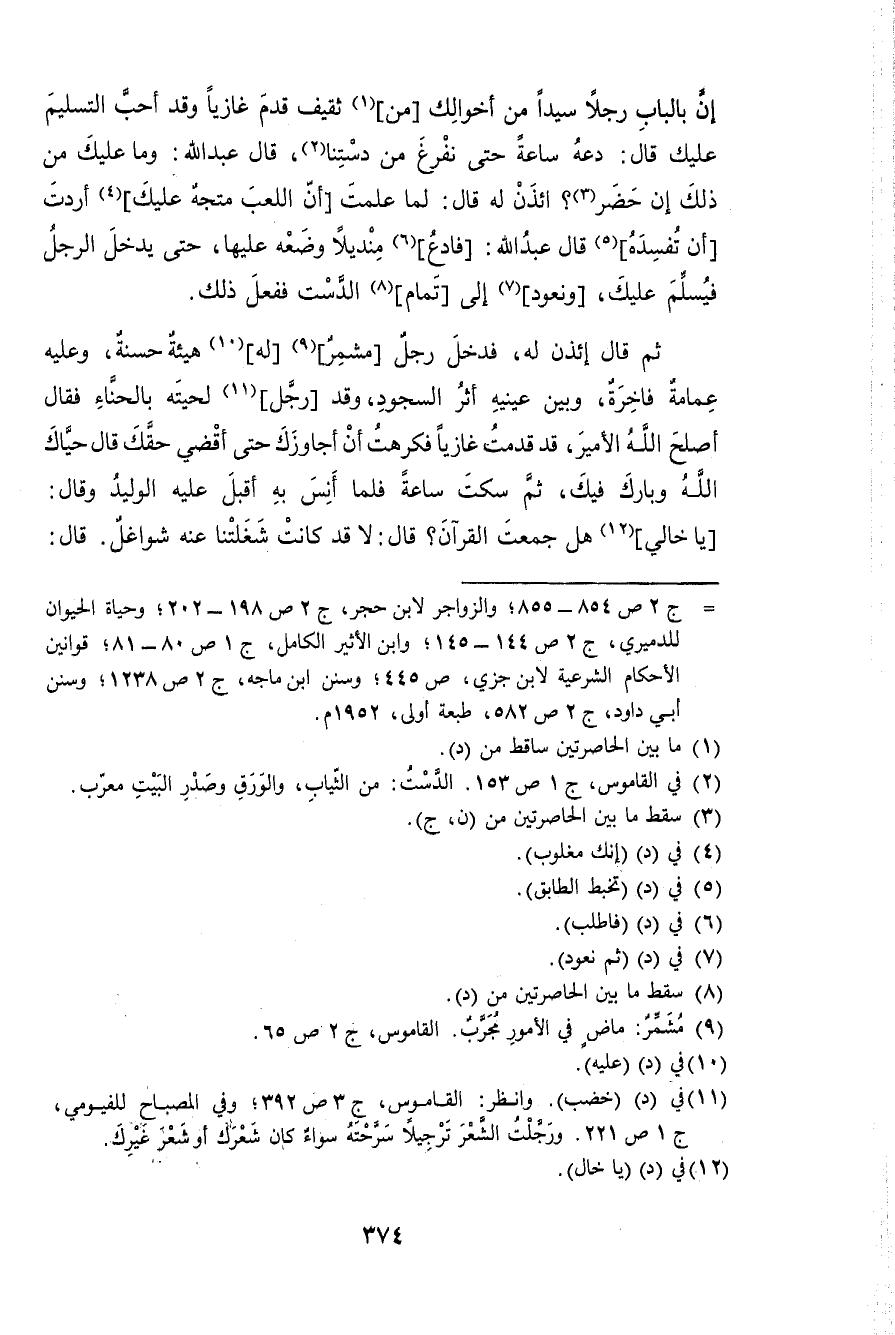 ثمَّ قَالَ إئذن لَهُ فَدخل رجل مشمر لَهُ هَيْئَة حَسَنَة وَعَلِيهِ عِمَامَة فاخرة وَبَين عَيْنَيْهِ أثر السُّجُود وَقد رجل لحيته بِالْحِنَّاءِ فَقَالَ أصلح الله الْأَمِير قد قدمت غازيا فَكرِهت أَن أجاوزك حَتَّى أَقْْضِي حَقك قَالَ حياك الله وَبَارك فِيك ثمَّ سكت سَاعَة فَلَمَّا أنس بِهِ أقبل عَلَيْهِ الْوَلِيد وَقَالَ يَا خَالِي هَل جمعت الْقُرْآن قَالَ لَا قد كَانَت شَغَلَتْنَا عَنهُ شواغل قَالَ
