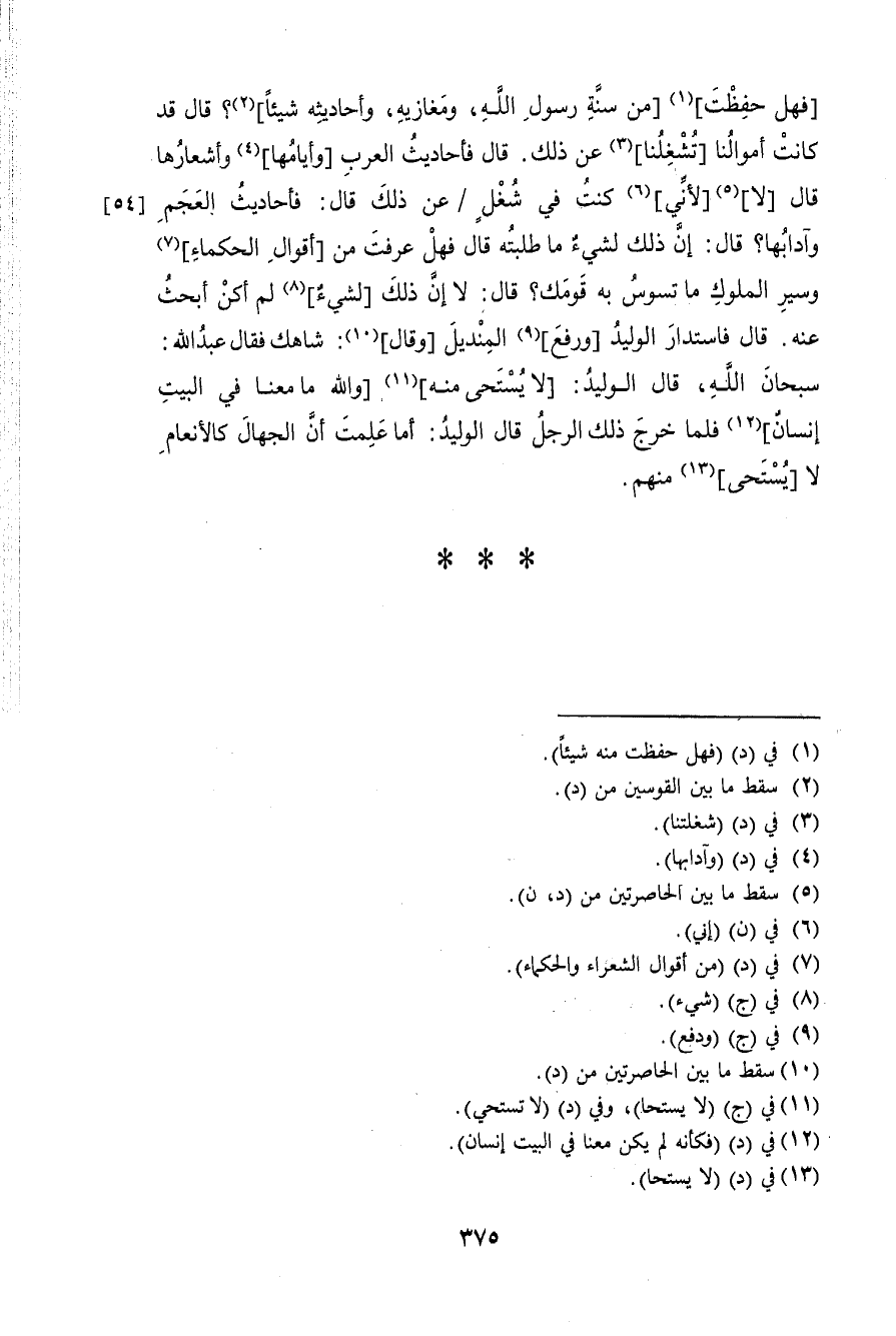 فَهَل حفظت من سنة رَسُول الله ومغازيه وَأَحَادِيثه شَيْئا قَالَ قد كَانَت أَمْوَالنَا تشغلنا عَن ذَلِك قَالَ فأحاديث الْعَرَب وأيامها وَأَشْعَارهَا قَالَ لَا لِأَنِّي كنت فِي شغل عَن ذَلِك قَالَ فأحاديث الْعَجم وآدابها قَالَ إِن ذَلِك لشَيْء مَا طلبته قَالَ فَهَل عرفت من أَقْوَال الْحُكَمَاء وسير الْمُلُوك مَا تسوس بِهِ قَوْمك قَالَ لَا إِن ذَلِك لشَيْء لم أكن أبحث عَنهُ قَالَ فَاسْتَدَارَ الْوَلِيد وَرفع المنديل وَقَالَ شاهك فَقَالَ عبد الله سُبْحَانَ الله قَالَ الْوَلِيد لَا يستحي مِنْهُ وَالله مَا مَعنا فِي الْبَيْت إِنْسَان فَلَمَّا خرج ذَلِك الرجل قَالَ الْوَلِيد أما علمت أَن الْجُهَّال كالأنعام لَا يستحي مِنْهُم