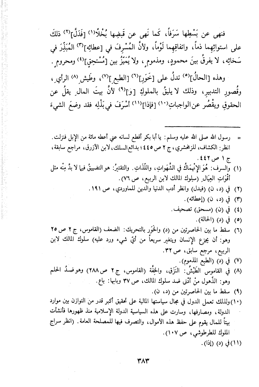 وَهَذِه الْحَال تدل على خور الطَّبْع وطيش الرَّأْي وقصور التَّدْبِير وَذَلِكَ لَا يَلِيق بالملوك وَلِأَن بَيت المَال يقل عَن الْحُقُوق وَيقصر عَن الْوَاجِبَات فَإِذا أسرف فِي بذله فقد وضع الشَّيْء