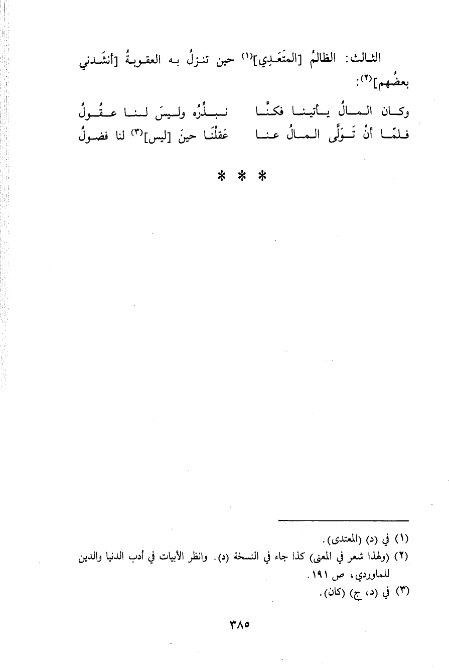الثَّالِث الظَّالِم المعتدي حِين تنزل بِهِ الْعقُوبَة أَنْشدني بَعضهم