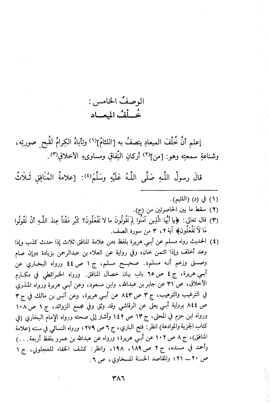 إعلم أَن خلف الميعاد بِهِ اللئام وتأباه الْكِرَام لقبح صوري وشناعة سمعته وَهُوَ من أَرْكَان النِّفَاق ومساوىء الْأَخْلَاق