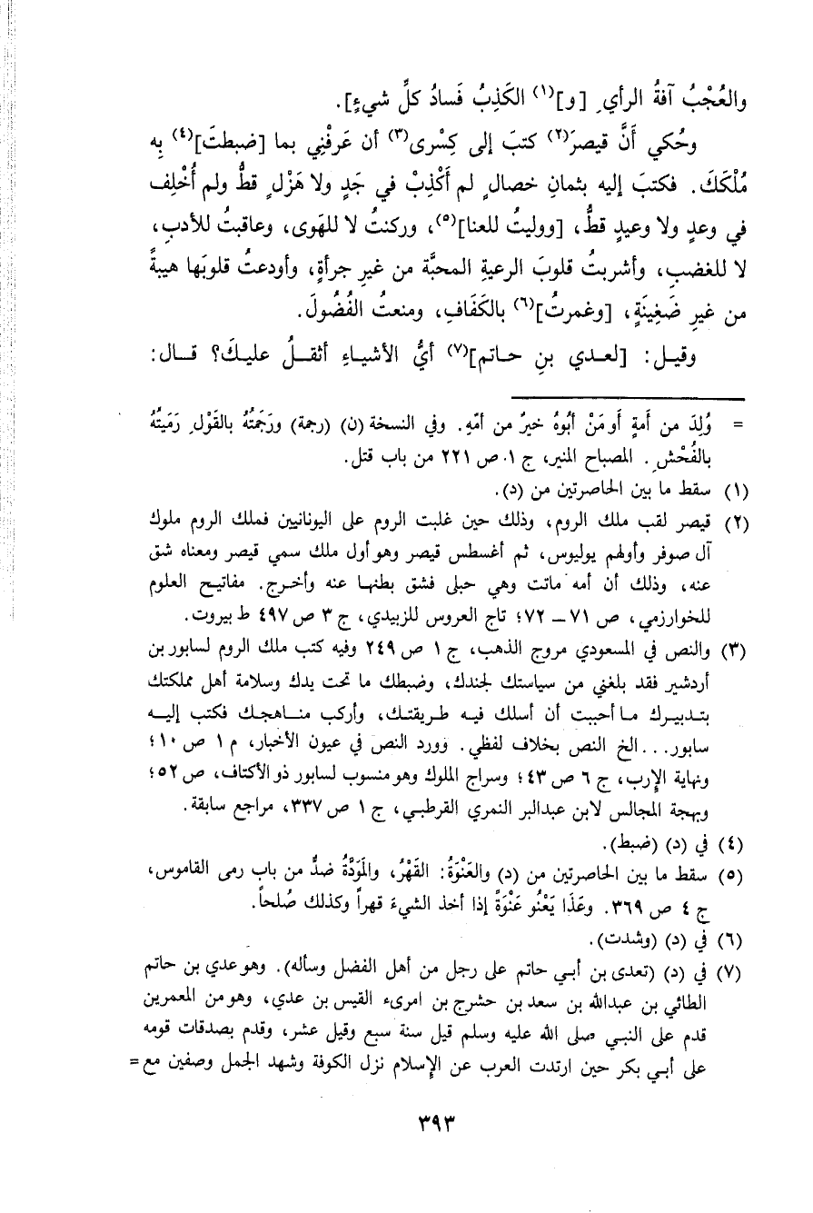 وَحكي أَن قَيْصر كتب إِلَى كسْرَى أَن عرفني بِمَا ضبطت بِهِ ملكك فَكتب إِلَيْهِ بثمان خِصَال لم أكذب فِي جد ولاهزل قطّ وَلم أخلف فِي وعد وَلَا وَعِيد قطّ وَوليت للعنا وركنت لَا للهوى وعاقبت للأدب لَا للغضب وأشربت قُلُوب الرّعية الْمحبَّة من غير جرْأَة وأودعت قلوبها هَيْبَة من غير ضغينة وغمرت بالكفاف ومنعت الفضول