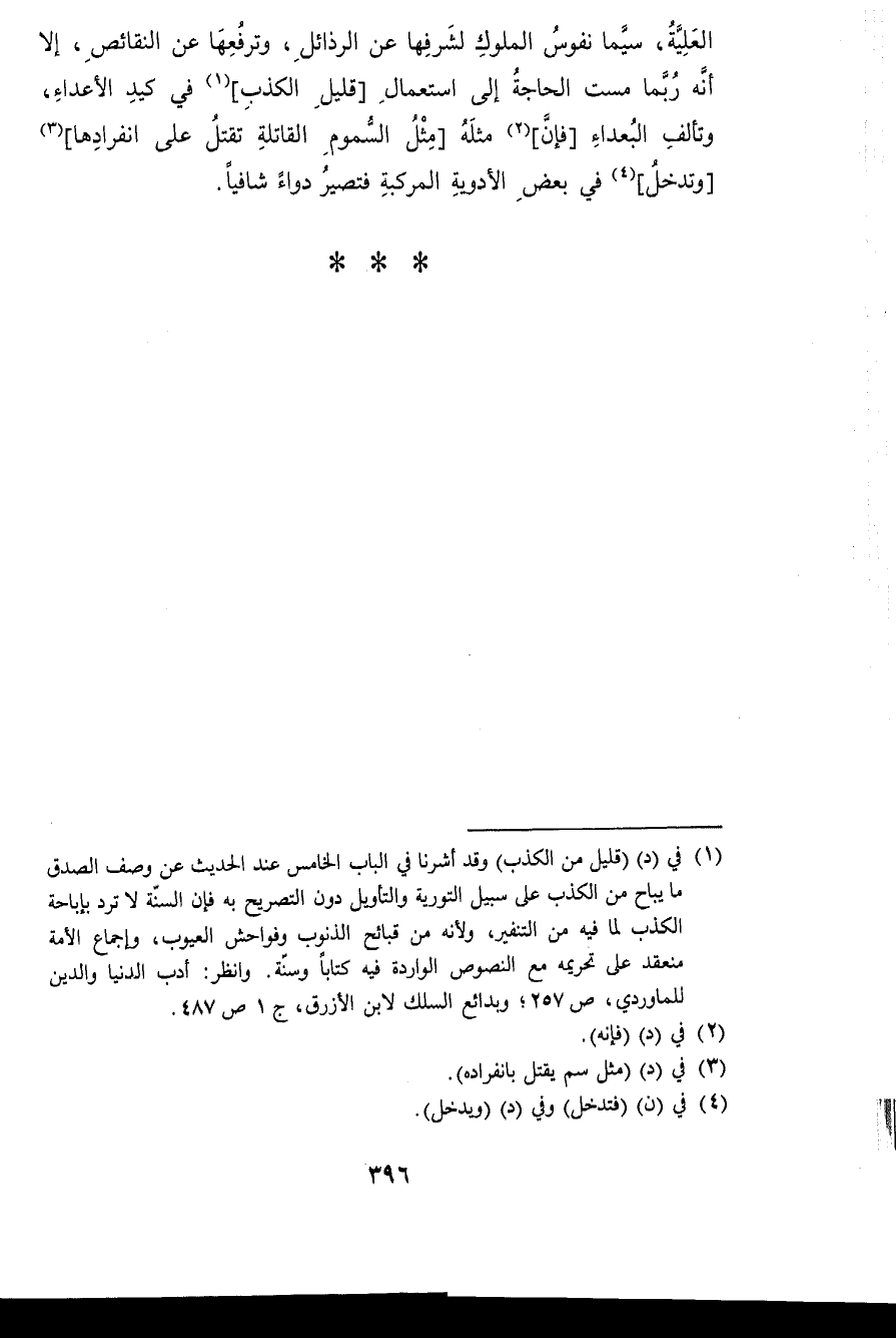 الْعلية سِيمَا نفوس الْمُلُوك لشرفها عَن الرذائل وترفعها عَن النقائص إِلَّا أَنه رُبمَا مست الْحَاجة إِلَى اسْتِعْمَال قَلِيل الْكَذِب فِي كيد الْأَعْدَاء وتألف الْبعدَاء فَإِن مثله مثل السمُوم القاتلة تقتل على انفرادها وَتدْخل فِي بعض الْأَدْوِيَة المركبة فَتَصِير دَوَاء شافيا