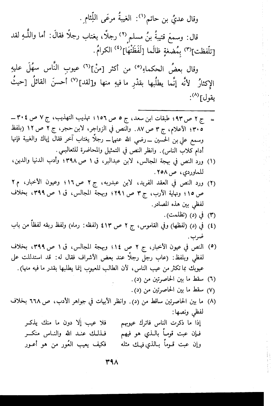 قَالَ وَسمع قُتَيْبَة بن مُسلم رجلا يغتاب رجلا فَقَالَ أما وَالله لقد تلفظت بمضغة ظَالِما لفظتها الْكِرَام