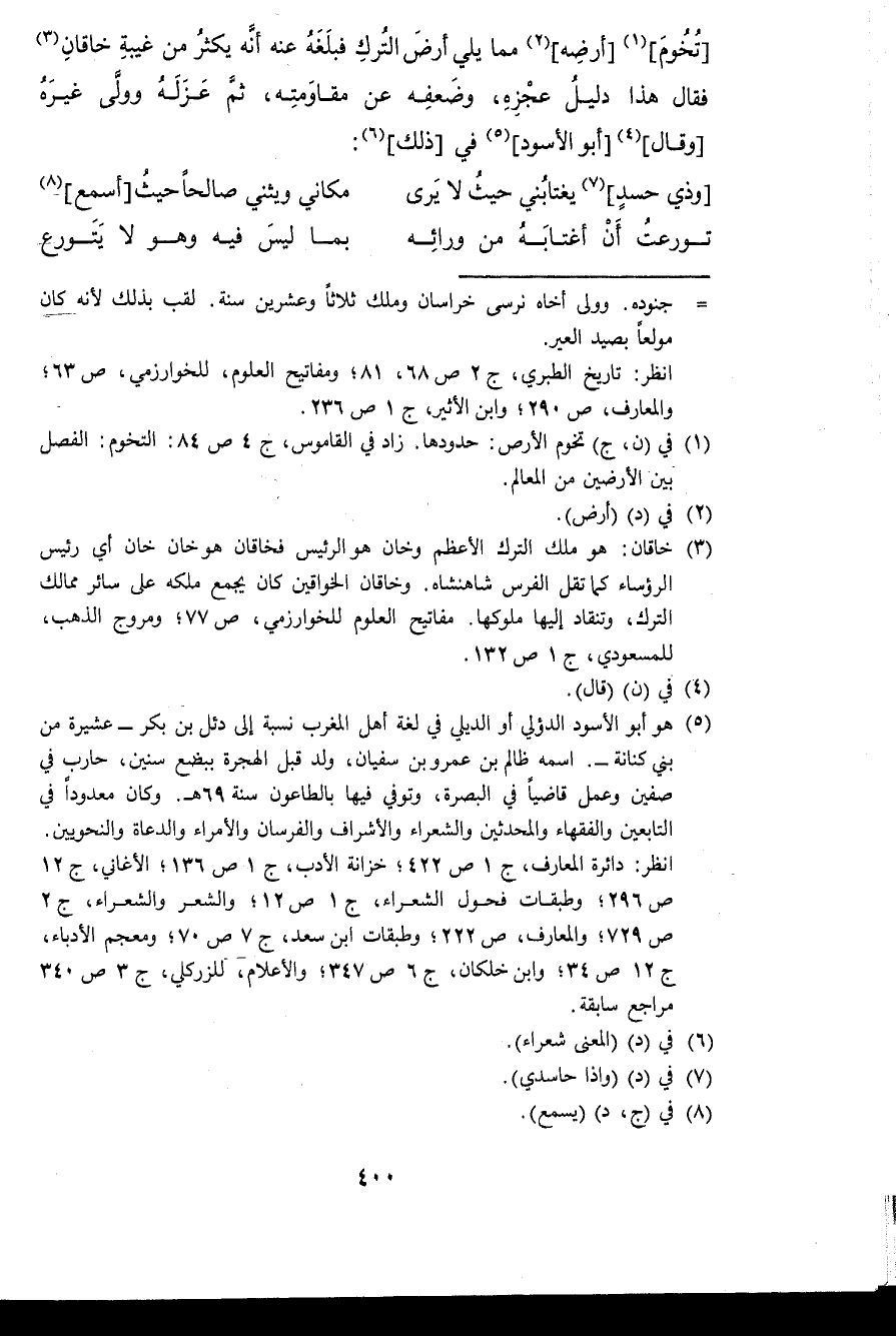 تخوم أرضه مِمَّا يَلِي أَرض التّرْك فَبَلغهُ عَنهُ أَنه يكثر من غيبَة خاقَان فَقَالَ هَذَا دَلِيل عَجزه وَضَعفه عَن مقاومته ثمَّ عَزله وَولى غَيره وَقَالَ أَبُو الْأسود فِي ذَلِك