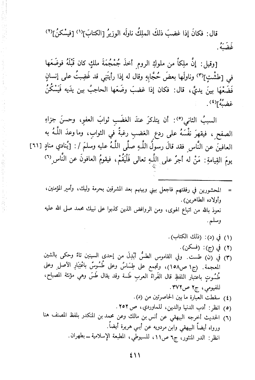 السَّبَب الثَّانِي أَن يتَذَكَّر عِنْد الْغَضَب ثَوَاب الْعَفو وَحسن جَزَاء الصفح فيقهر نَفسه على ردع الْغَضَب رَغْبَة فِي الثَّوَاب وَمَا وعد الله بِهِ العافين عَن النَّاس فقد قَالَ رَسُول الله صلى الله عَلَيْهِ وَسلم يُنَادي مُنَاد يَوْم الْقِيَامَة من لَهُ أجر على الله تَعَالَى فَليقمْ فَيقوم الْعَافُونَ عَن النَّاس
