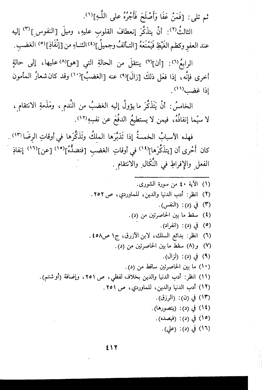 فَهَذِهِ الْأَسْبَاب الْخَمْسَة إِذا تدبرها الْملك وتذكرها فِي أَوْقَات الرِّضَا كَانَ أَحْرَى أَن يتذكرها فِي أَوْقَات الْغَضَب فتصده عَن إِنْفَاذ الْفِعْل والإفراط فِي النكال والانتقام
