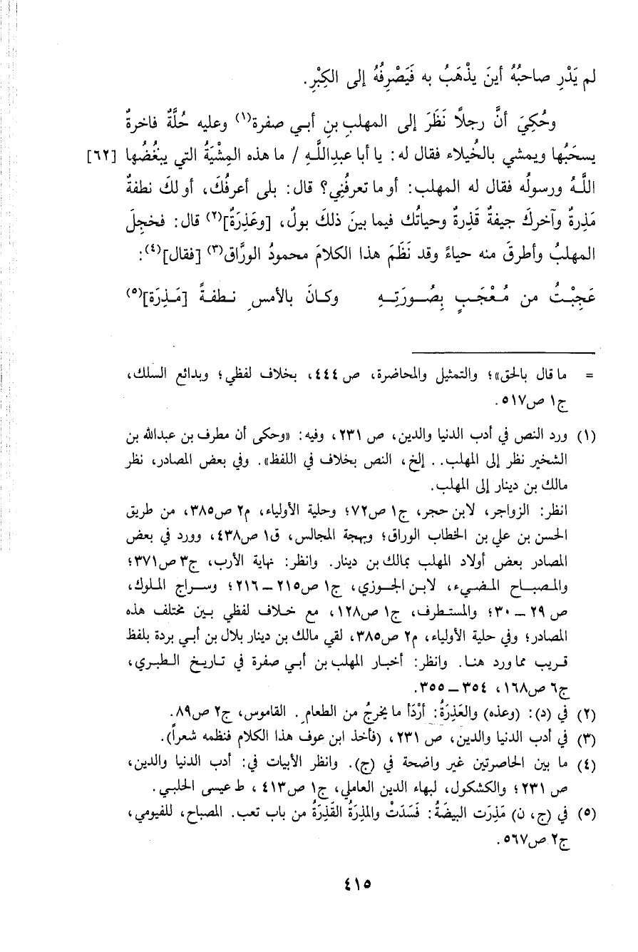وَحكي أَن رجلا نظر إِلَى الْمُهلب بن أبي صفرَة وَعَلِيهِ حلَّة فاخرة يسحبها وَيَمْشي بالخيلاء فَقَالَ لَهُ يَا أَبَا عبد الله مَا هَذِه المشية الَّتِي يبغضها الله وَرَسُوله فَقَالَ لَهُ الْمُهلب أَو مَا تعرفنِي قَالَ بلَى أعرفك أَو لَك نُطْفَة مذرة وآخرك جيفة قذرة وحياتك فِيمَا بَين ذَلِك بَوْل وعذرة قَالَ فَخَجِلَ الْمُهلب وأطرق مِنْهُ حَيَاء وَقد نظم هَذَا الْكَلَام مَحْمُود الْوراق فَقَالَ