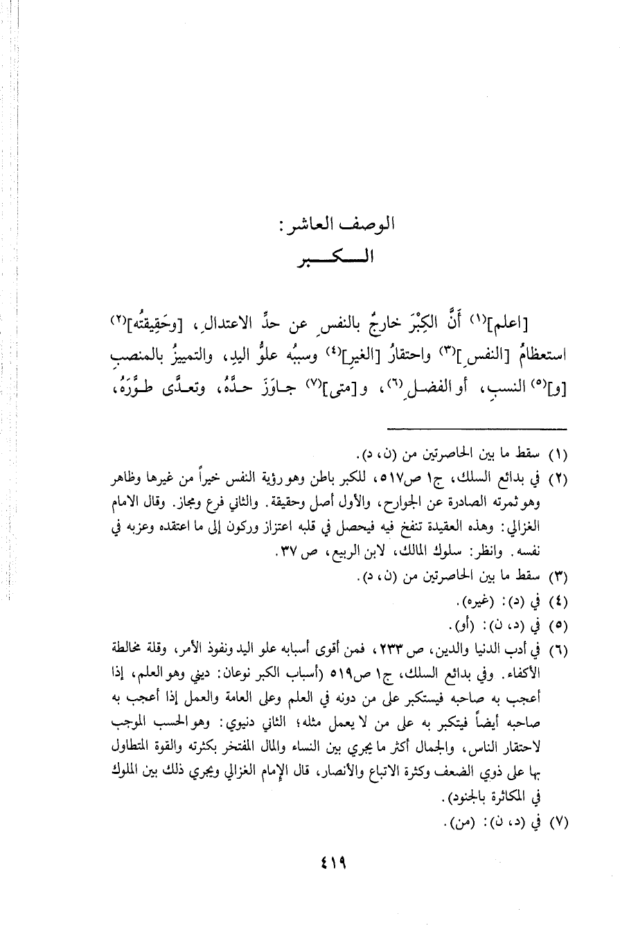 اعْلَم أَن الْكبر خَارج بِالنَّفسِ عَن حد الِاعْتِدَال وَحَقِيقَته استعظام النَّفس واحتقار الْغَيْر وَسَببه علو الْيَد والتمييز بالمنصب وَالنّسب أَو الْفضل وَمَتى جَاوز حَده وتعدى طوره