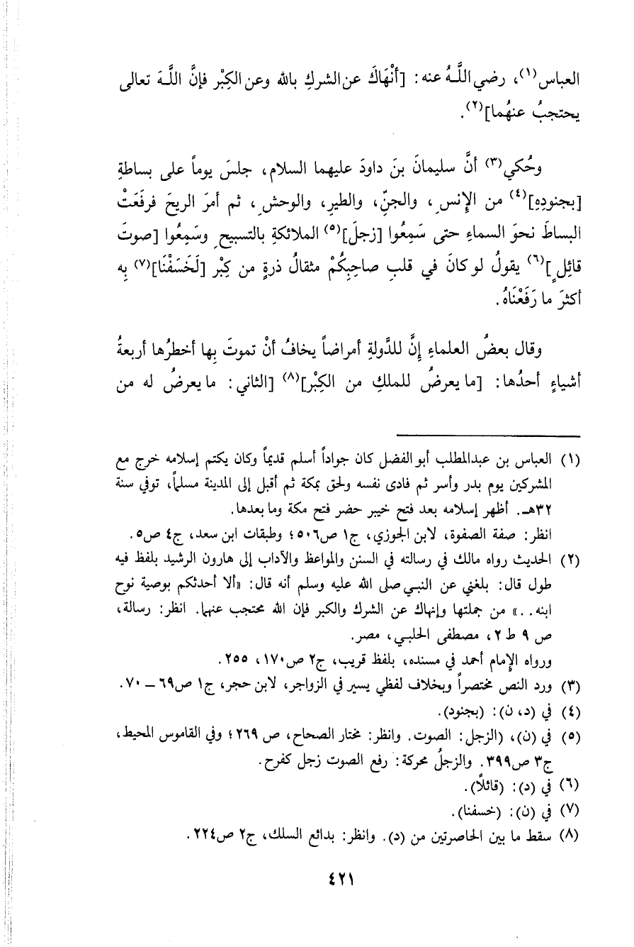 وَحكي أَن سُلَيْمَان بن دَاوُد عَلَيْهِمَا السَّلَام جلس يَوْمًا على بساطة بجُنُوده من الْإِنْس وَالْجِنّ وَالطير والوحش ثمَّ أَمر الرّيح فَرفعت الْبسَاط نَحوا السَّمَاء حَتَّى سمعُوا زجل اللائكة بالتسبيح وسمعوا صَوت قَائِل يَقُول لَو كَانَ فِي قلب صَاحبكُم مِثْقَال ذرة من كبر لخسفنا بِهِ اكثر مَا رفعناه