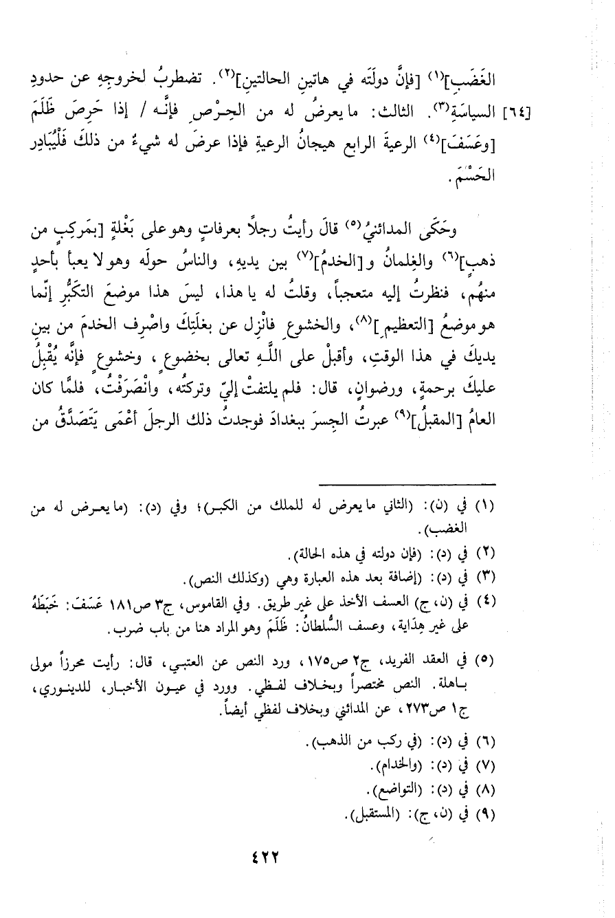 الْغَضَب فَإِن دولته فِي هَاتين الْحَالَتَيْنِ تضطرب لِخُرُوجِهِ عَن حُدُود السياسة الثَّالِث مَا يعرض لَهُ من الْحِرْص فَإِنَّهُ إِذا حرص ظلم وعسف الرّعية الرَّابِع هيجان الرّعية فَإِذا عرض لَهُ شَيْء من ذَلِك فليبادر الحسم