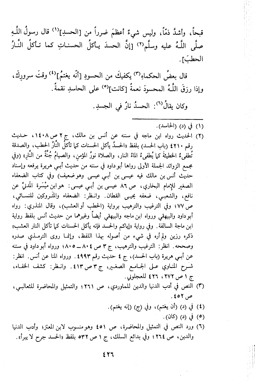 قبحا وَأَشد ذما وَلَيْسَ شَيْء أعظم ضَرَرا من الْحَسَد قَالَ رَسُول الله ص = إِن الْحَسَد يَأْكُل الْحَسَنَات كَمَا تَأْكُل النَّار الْحَطب