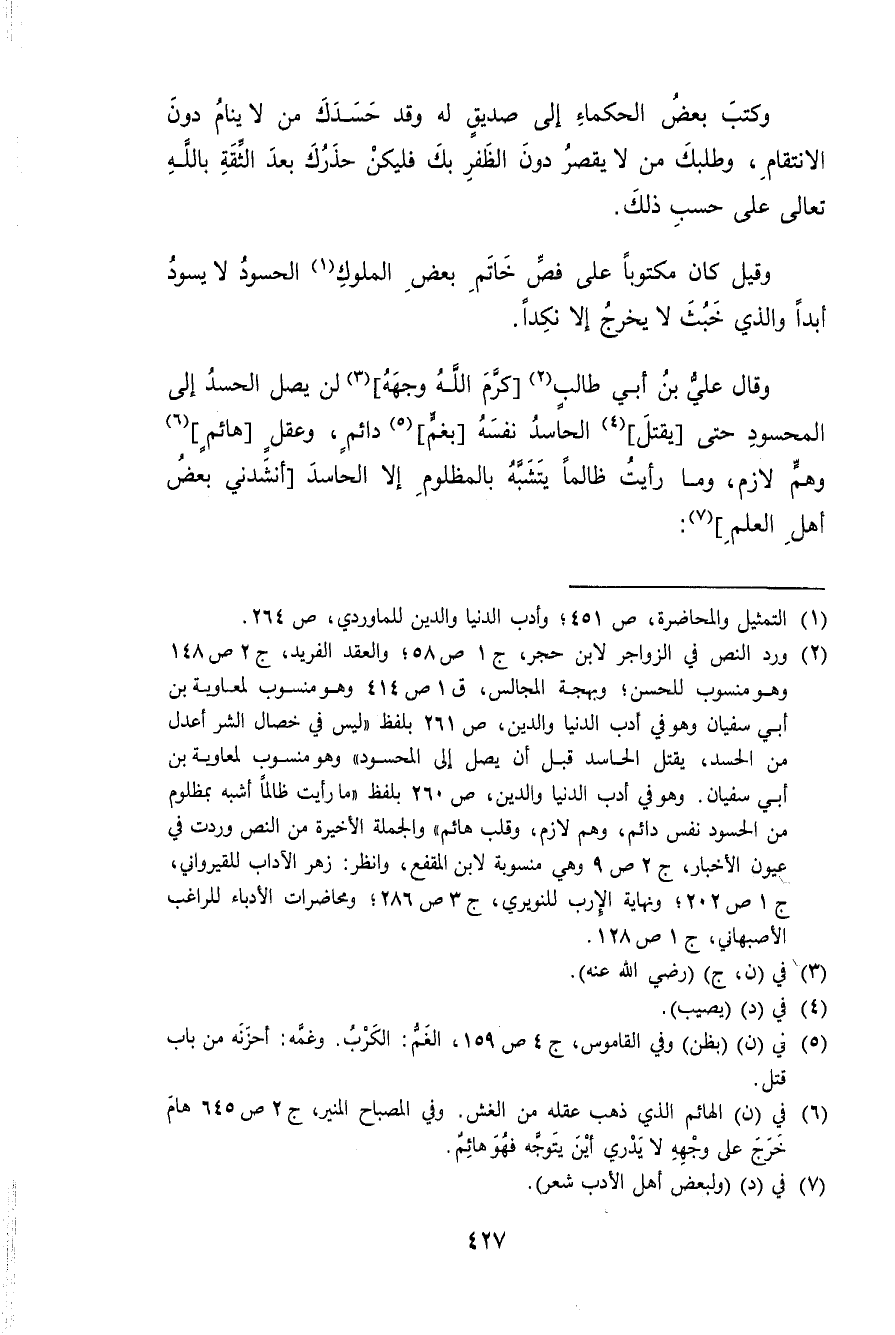 وَقَالَ عَليّ بن ابي طَالب كرم الله وَجهه لن يصل الْحَسَد الى الْمَحْسُود حَتَّى يقتل الْحَاسِد نَفسه بغم دَائِم وعقل هائم وهم لَازم وَمَا رايت ظَالِما يتشبه بالمظلوم إِلَّا الْحَاسِد أَنْشدني بعض أهل الْعلم