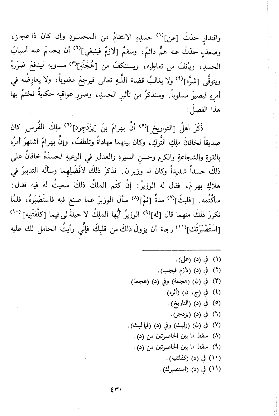 واقتدار حدث عَن حسده الانتقام من الْمَحْسُود وَإِن كَانَ ذَا عجز وَضعف حدث عَنهُ هم دَائِم وسقم لَازم فَيَنْبَغِي أَن يحسم عَنهُ أَسبَاب الْحَسَد ويأنف من تعاطيه ويستنكف من هجنة مُسَاوِيَة ليدفع ضَرَره ويتوقى شَره وَلَا يغالب قَضَاء الله تَعَالَى فَيرجع مَغْلُوبًا وَلَا يُعَارضهُ فِي أمره فَيصير مسلوبا وَسَنذكر من تَأْثِير الْحَسَد وضرر عواقبه حِكَايَة نختم بهَا هَذَا الْفَصْل ذكر أهل التواريخ أَن بهْرَام بن يزدجرد ملك الْفرس كَانَ صديقا لخاقان ملك التّرْك وَكَانَ بَينهمَا مهادلة وتلطف وَإِن بهْرَام اشْتهر أمره بِالْقُوَّةِ والشجاعة وَالْكَرم وَحسن السِّيرَة وَالْعدْل فِي الرّعية فحسده خاقَان على ذَلِك حسدا شَدِيدا وَكَانَ لَهُ وزيران فَذكر ذَلِك لأفضلهما وَسَأَلَهُ التَّدْبِير فِي هَلَاك بهْرَام فَقَالَ لَهُ الْوَزير إِن كتم الْملك ذَلِك سعيت لَهُ فِيهِ فَقَالَ سأكتمه فَلبث مُدَّة ثمَّ سَأَلَ الْوَزير عَمَّا صنع فِيهِ فاستصبره فَلَمَّا تكَرر ذَلِك مِنْهُمَا قَالَ لَهُ الْوَزير أَيهَا الْملك لَا حِيلَة لي فِيمَا كلفتنيه استصبرتك رَجَاء أَن يَزُول ذَلِك من قَلْبك فَإِنِّي رَأَيْت الْحَامِل لَك عَلَيْهِ