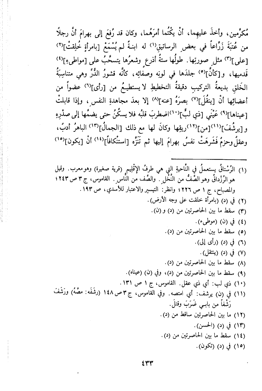 مكرمين وَأخذ عَلَيْهِمَا أَن يكتما أَمرهمَا وَكَانَ قد رفع إِلَى بهْرَام أَن رجلا من عتبَة زراعا فِي بعض الرساتيق لَهُ ابْنه لم يسمع بِامْرَأَة خلقت على مثل صورتهَا طولهَا سِتَّة أَذْرع وشعرها يتسحب على مواطىء قدميها وَكَأن جلدهَا فِي لَونه وصفائه كَأَنَّهُ قشور الدّرّ وَهِي متناسبة الْخلق بديعة التَّرْكِيب دقيقة التخطيط لَا يَسْتَطِيع من رأى عضوا من أعضائها ان ينْقل بَصَره عَنهُ إِلَّا بعد مجاهدة النَّفس وَإِذا قابلت عَيناهَا عَيْني ذِي لب اضْطربَ قلبه فَلَا يسكن حَتَّى يضمها إِلَى صَدره ويرشف من رِيقهَا وَكَانَ لَهَا مَعَ ذَلِك الْجمال الباهر أدب وعقل وحزم فشرهت نفس بهْرَام إِلَيْهَا ثمَّ تنزه استنكافا أَن يكون