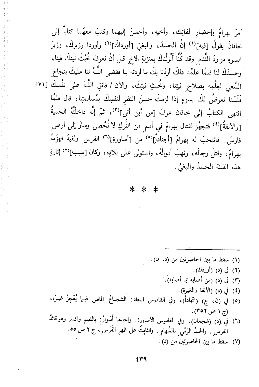 أَمر بهْرَام بإحضار الفاتك وأخيه وَأحسن إِلَيْهِمَا وَكتب مَعهَا كتابا إِلَى خاقَان يَقُول فِيهِ إِن الْحَسَد وَالْبَغي أورداك وأوردا وزيرك وَزِير السوء موارد النَّدَم وَقد كُنَّا أنزلناك بِمَنْزِلَة الاخ قبل أَن نَعْرِف خبث نيتك فِينَا وحسدك لنا فَلَمَّا علمنَا ذَلِك أردنَا بك مَا أردته بِنَا فَقضى الله لنا عَلَيْك بنجاح السَّعْي لعلمه بصلاح نيتنا وخبث نيتك والآن فَاتق الله على نَفسك فلسنا نعرض لَك بِسوء إِذا لَزِمت حسن النّظر لنَفسك بمسالمتنا قَالَ فَلَمَّا انْتهى الْكتاب إِلَى خاقَان عرف من أَيْن أَتَى ثمَّ إِنَّه داخلته الحمية والأنفة فتجهز لقِتَال بهْرَام فِي أُمَم من التّرْك لَا تحصى وَسَار إِلَى أَرض فَارس فانتخب لَهُ بهْرَام أجنادا من أساورة الْفرس ولقيه فَهَزَمَهُ بهْرَام وَقتل رِجَاله وَنهب أَمْوَاله وَاسْتولى على بِلَاده وَكَانَ سَبَب إثارة هَذِه الْفِتْنَة الْحَسَد وَالْبَغي