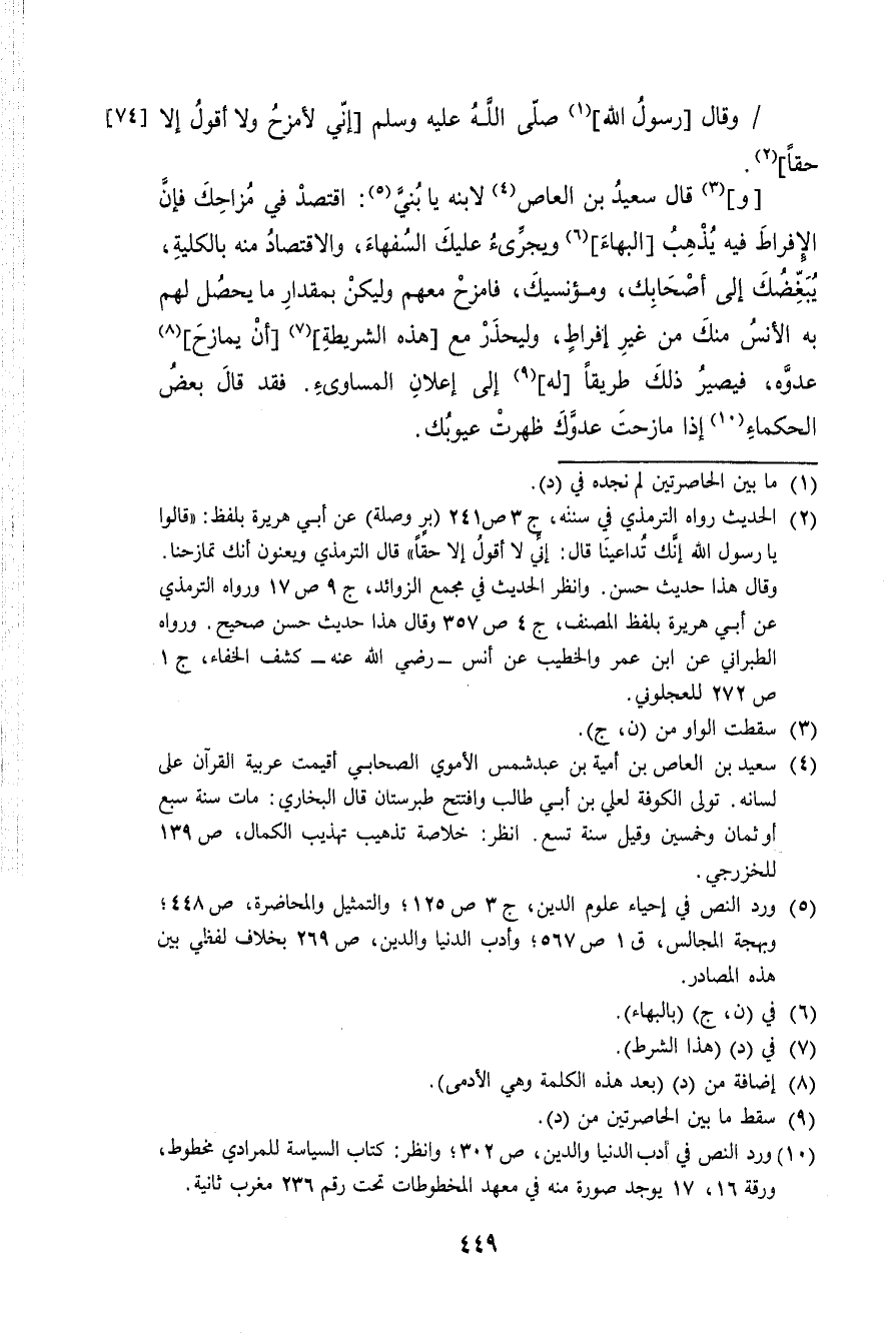 وَقَالَ سعيد بن الْعَاصِ لِابْنِهِ يَا بني اقتصد فِي مزاحك فَإِن الإفراط فِيهِ يذهب الْبَهَاء ويجريء عَلَيْك السُّفَهَاء والاقتصاد مِنْهُ بِالْكُلِّيَّةِ يبغضك إِلَى أَصْحَابك ومؤنسيك فامزح مَعَهم وَليكن بِمِقْدَار مَا يحصل لَهُم بِهِ الْأنس مِنْك من غير إفراط وليحذر مَعَ هَذِه الشريطة أَن يمازح عدوه فَيصير ذَلِك طَرِيقا لَهُ إِلَى إعلان المساوىء فقد قَالَ بعض الْحُكَمَاء إِذا مازحت عَدوك ظَهرت عيوبك