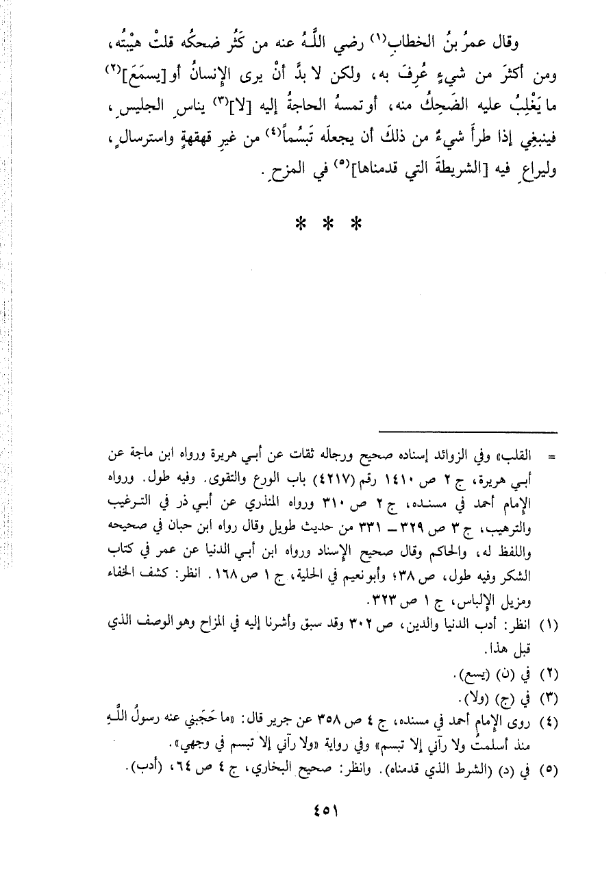 وَقَالَ عمر بن الْخطاب رَضِي الله عَنهُ من كثر ضحكه قلت هيبته وَمن أَكثر من شَيْء عرف بِهِ وَلَكِن لَا بُد أَن يرى الْإِنْسَان أَو يسمع مَا يغلب عَلَيْهِ الضحك مِنْهُ أَو تمسه الْحَاجة إِلَيْهِ لَا يناس الجليس فَيَنْبَغِي إِذا طَرَأَ شَيْء من ذَلِك أَن يَجعله تبسما من غير قهقهة واسترسال وليراع فِيهِ الشريطة الَّتِي قدمناها فِي المزح