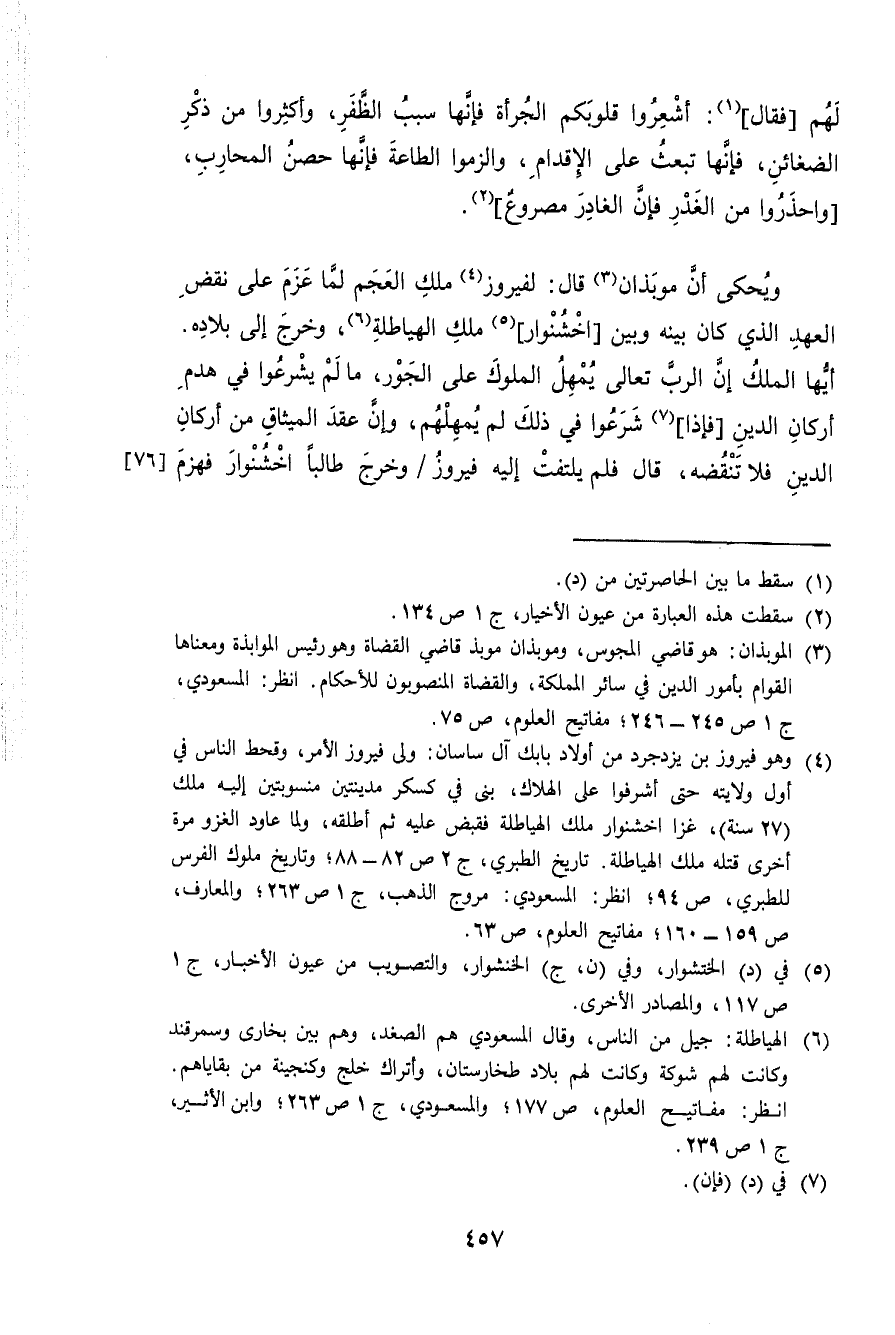 ويحكى أَن موبذان قَالَ لفيروز ملك الْعَجم لما عزم على نقض الْعَهْد الَّذِي كَانَ بَينه وَبَين اخشنوار ملك الهياطلة وَخرج إِلَى بِلَاده أَيهَا الْملك إِن الرب تَعَالَى يُمْهل الْمُلُوك على الْجور مالم يشرعوا فِي هدم أَرْكَان الدّين فَإِذا شرعوا فِي ذَلِك لم يمهلهم وَإِن عقد الْمِيثَاق من أَرْكَان الدّين فَلَا تنقضه قَالَ فَلم يلْتَفت إِلَيْهِ فَيْرُوز وَخرج طَالبا اخشنوار فَهزمَ