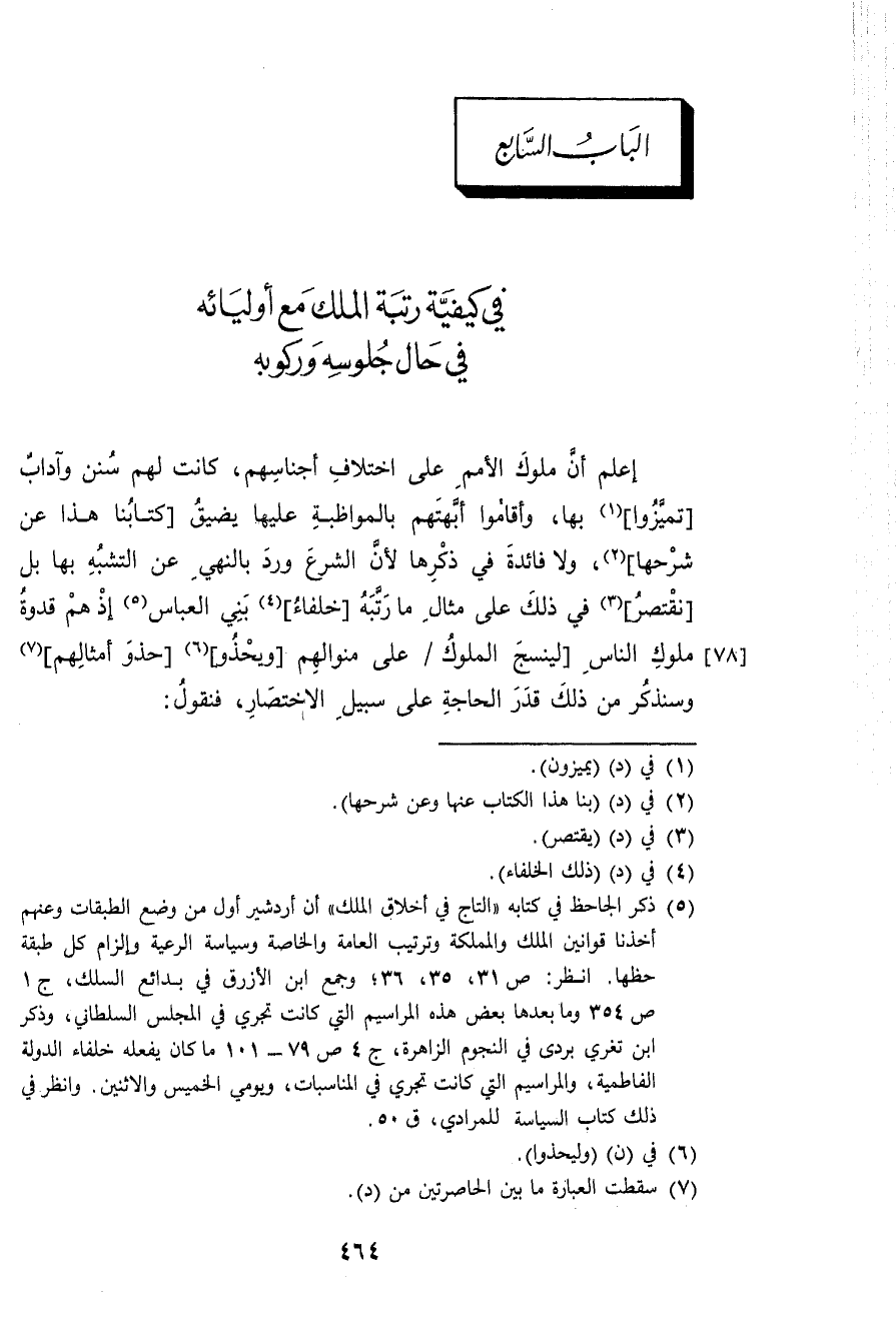 إعلم أَن مُلُوك الْأُمَم على اخْتِلَاف أجناسهم كَانَت لَهُم سنَن وآداب تميزوا بهَا وَأَقَامُوا أبهتهم بالمواظبة عَلَيْهَا يضيق كتَابنَا هَذَا عَن شرحها وَلَا فَائِدَة فِي ذكرهَا لِأَن الشَّرْع ورد بِالنَّهْي عَن التَّشَبُّه بهَا بل نقتصر فِي ذَلِك على مِثَال مَا رتبه خلفاء بني الْعَبَّاس إِذْ هم قدوة مُلُوك النَّاس لينسج الْمُلُوك على منوالهم ويحذو حَذْو أمثالهم وَسَنذكر من ذَلِك قدر الْحَاجة على سَبِيل الِاخْتِصَار فَنَقُول